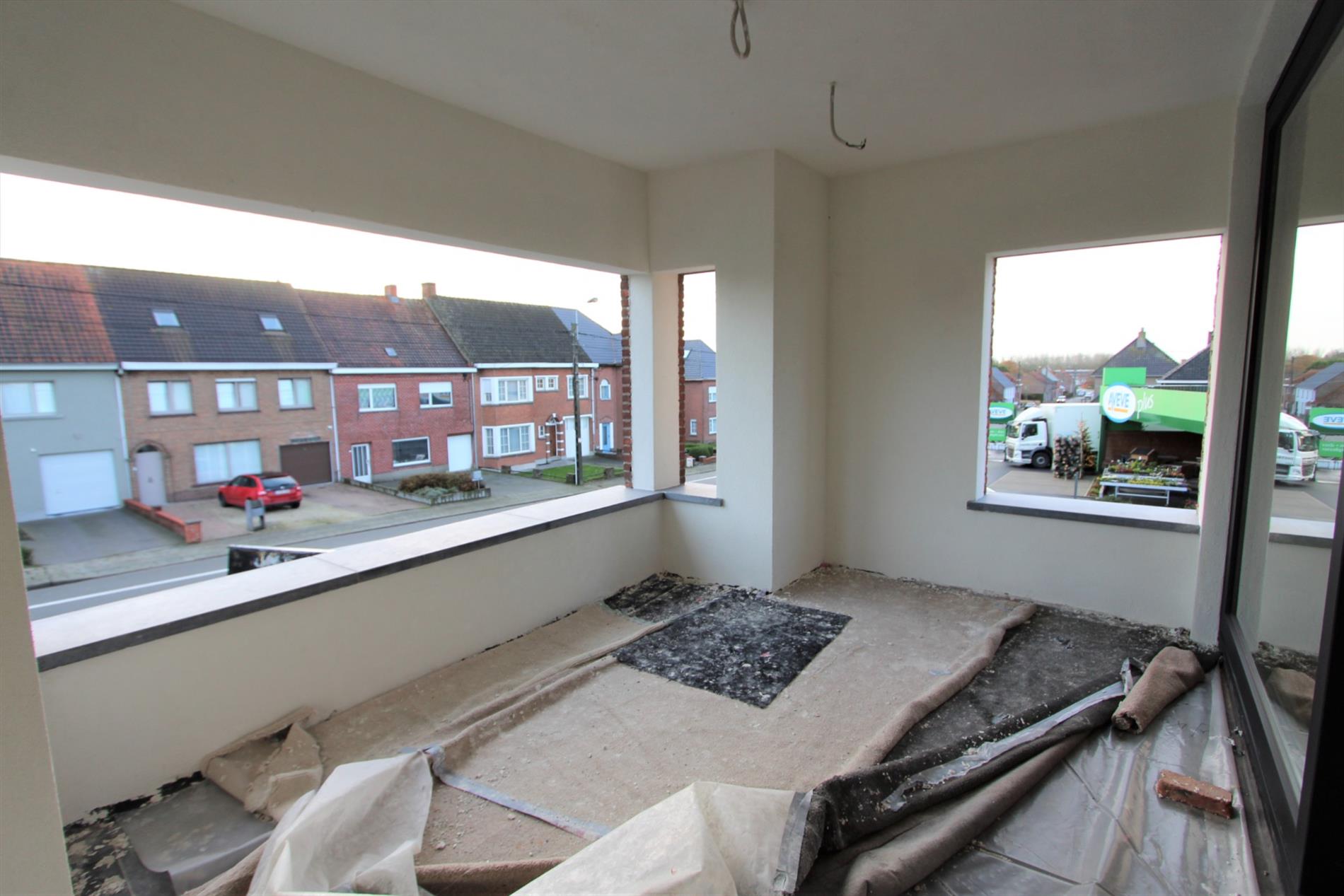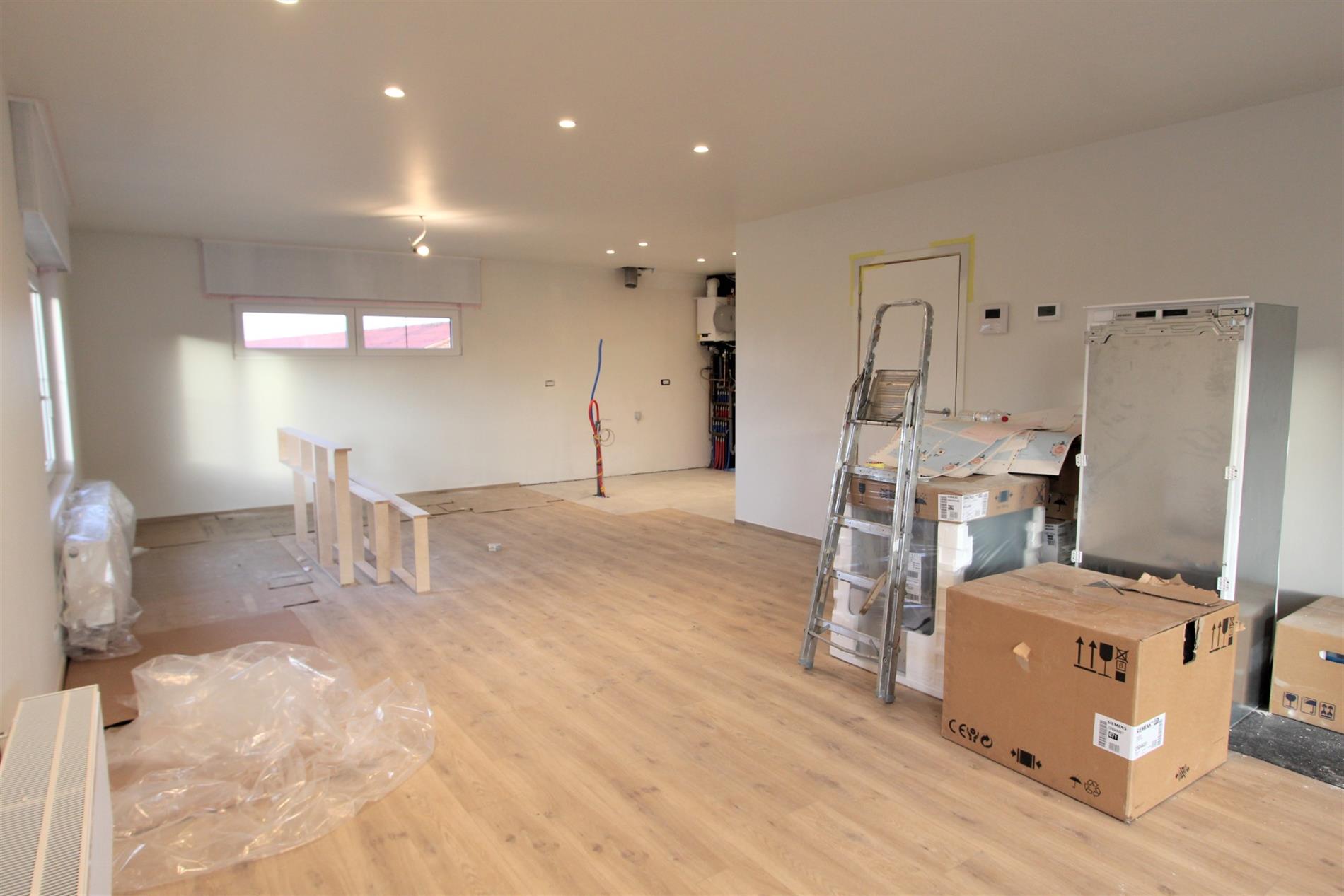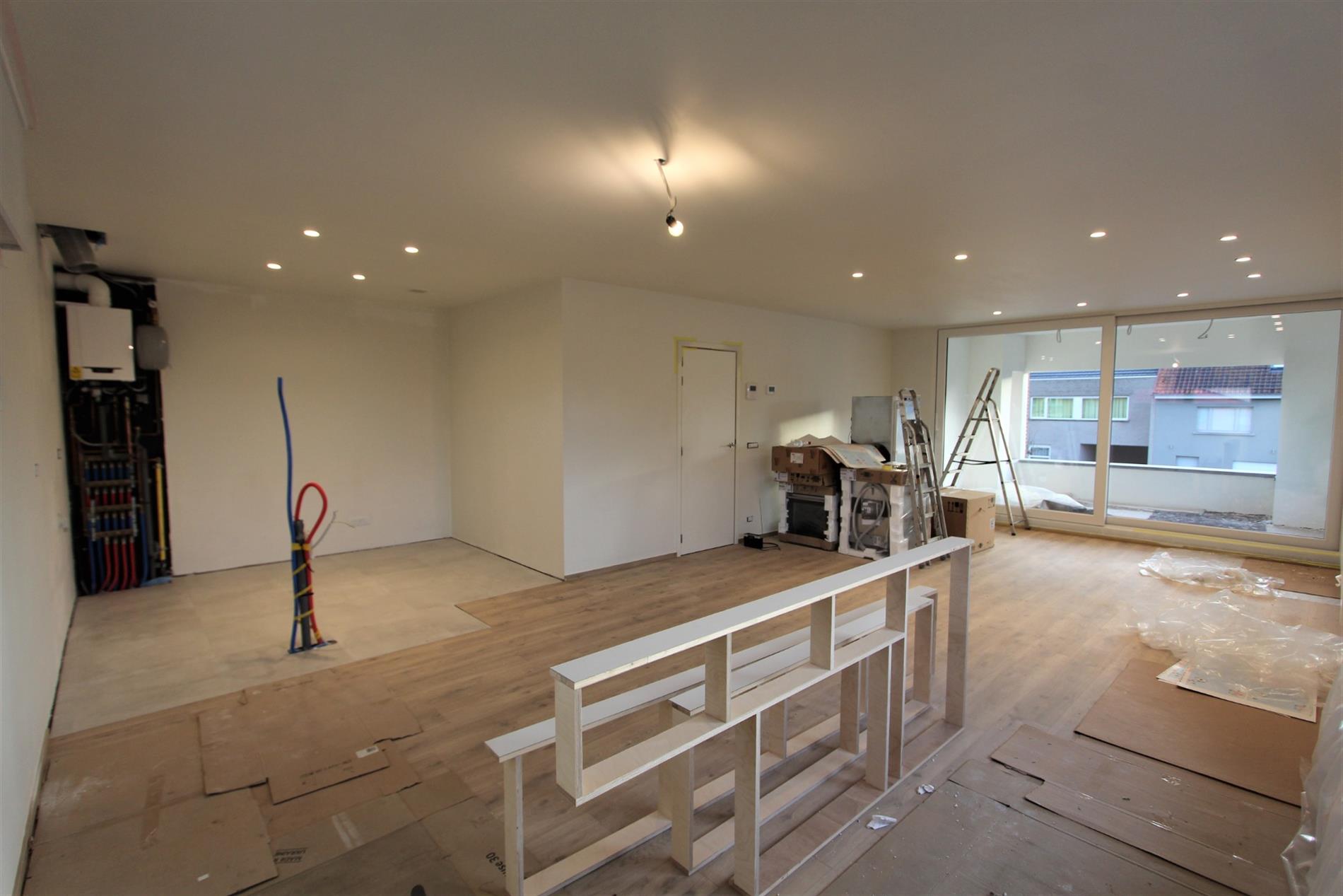 Deze parel is gelegen op het eerste verdiep. Het appartement is enkel bereikbaar via de vaste trap vanuit de gemeenschappelijke gang. Via de inkomhal is er toegang tot alle ruimtes van het appartement. De lichtrijke leefruimte met open, volledig ingerichte keuken geeft rechtstreeks toegang tot het terras. De keuken wordt nog geplaatst en zal voorzien zijn van alle comfort (vaatwasser | oven | microgolf | inductie kookplaat |koelkast met vriesvak | spoelbak).