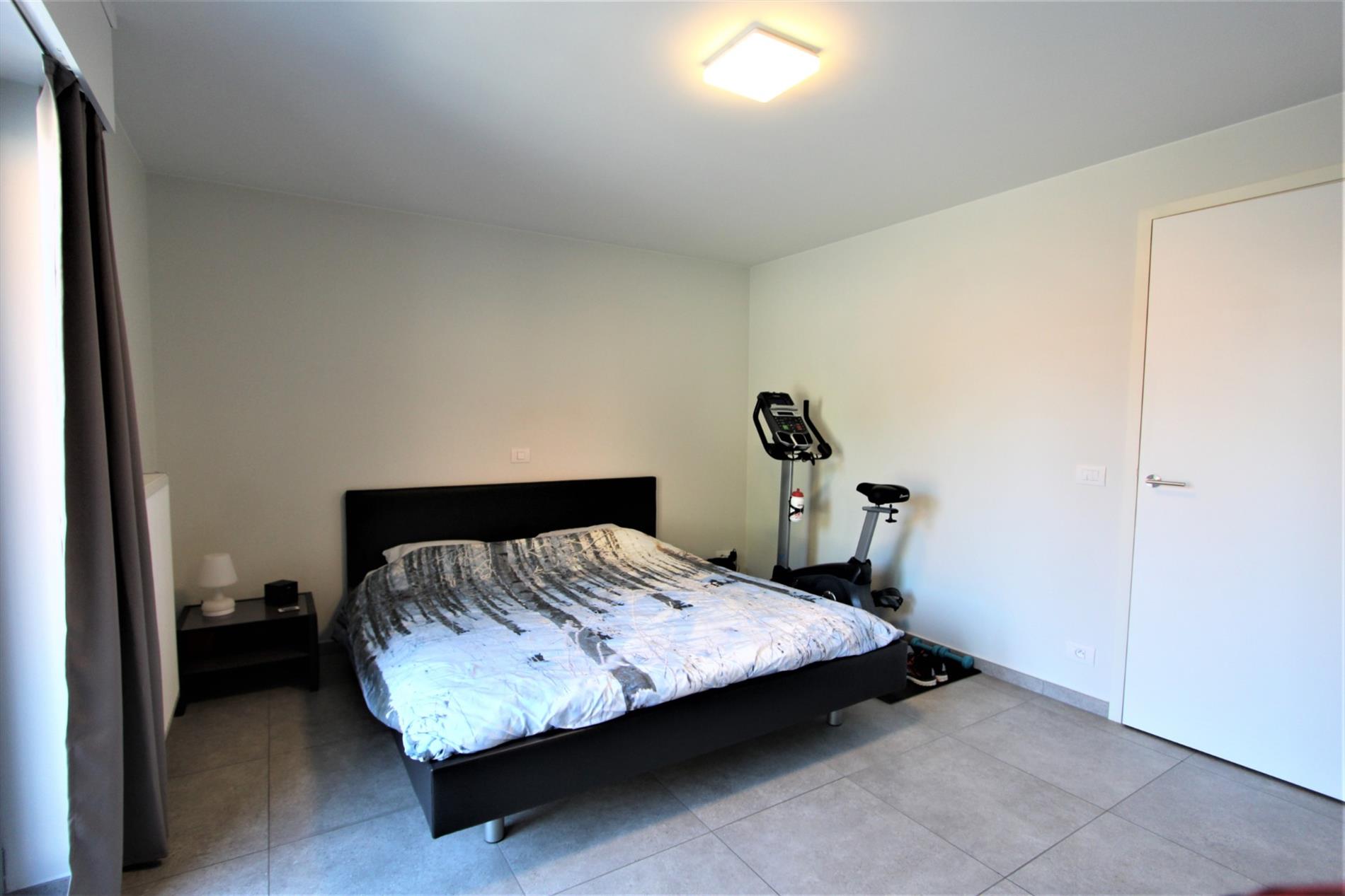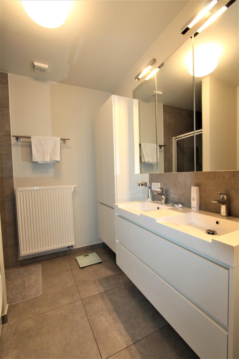 De badkamer bestaat uit een douche - een dubbelvoudige lavabo met meubel en de aansluiting voor de wasmachine en de droogkast. Via de slaapkamer komt U terecht op het terras.