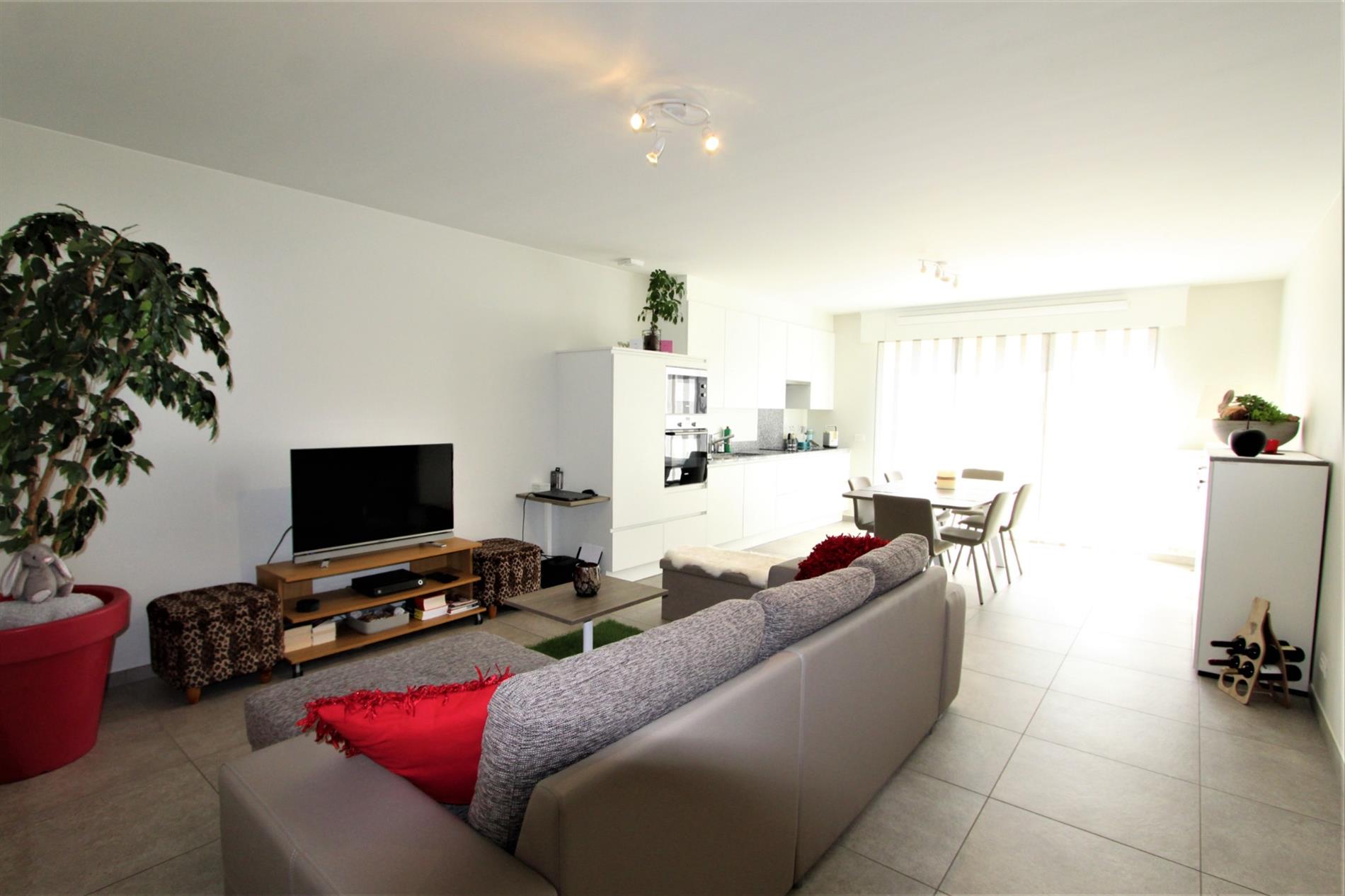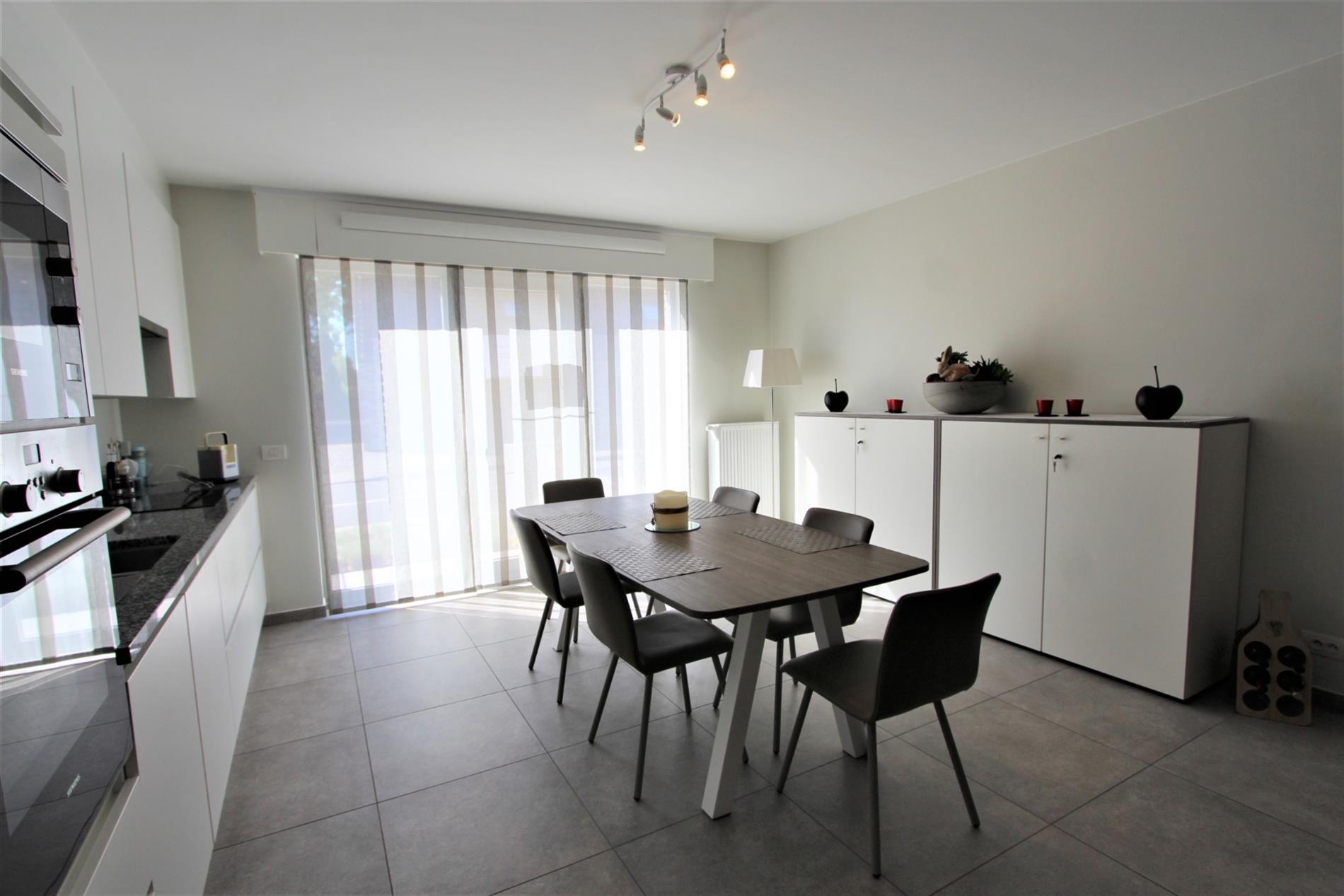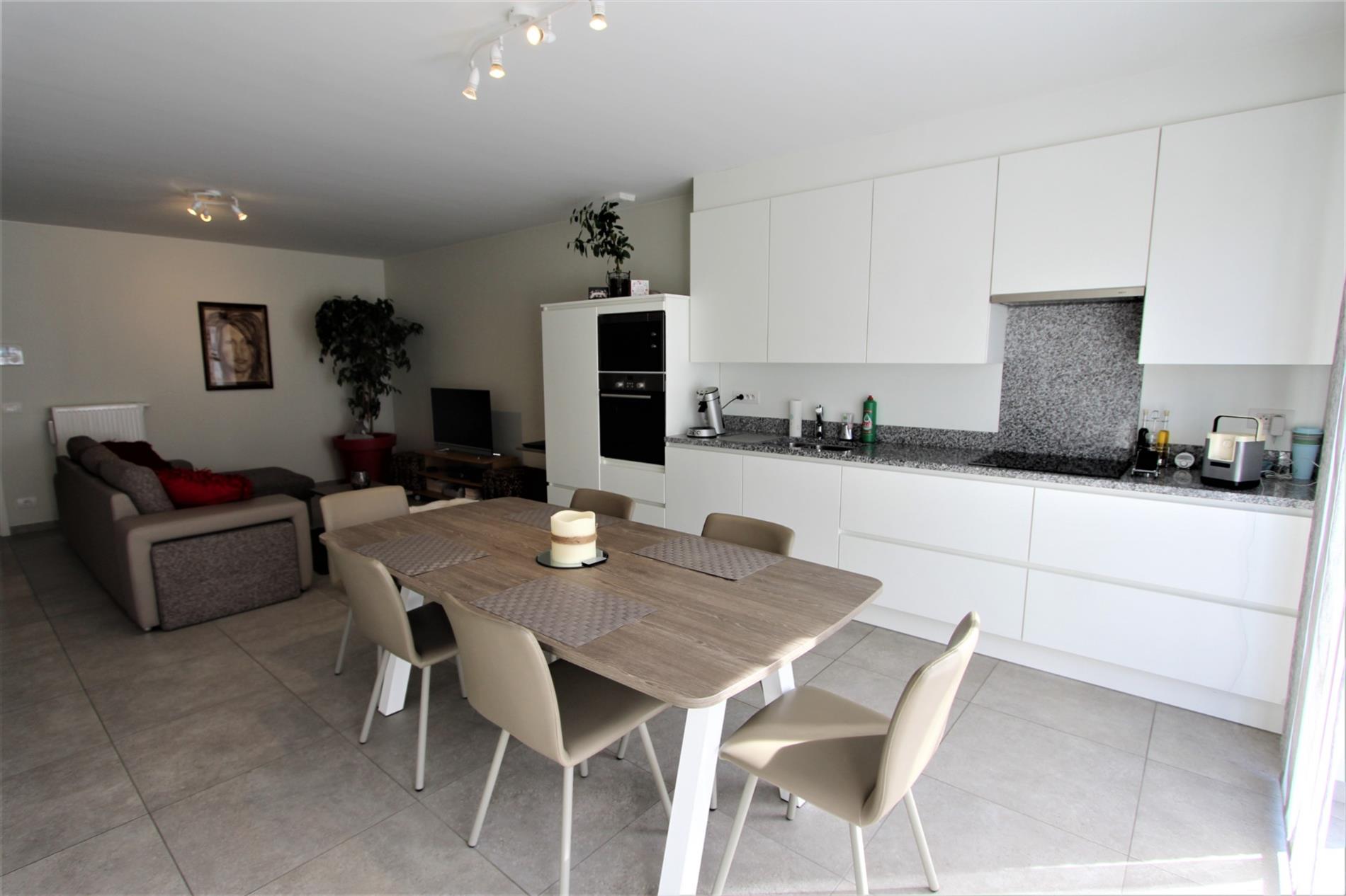 U komt binnen in de inkomhal die toegang biedt tot het gastentoilet. Vervolgens komt U terecht in de woonkamer met aansluitend de open ingerichte keuken. De keuken werd voorzien van alle comfort ( dampkap - keramische kookplaat - vaatwas - koelkast met vriesvak - oven en microgolf ).