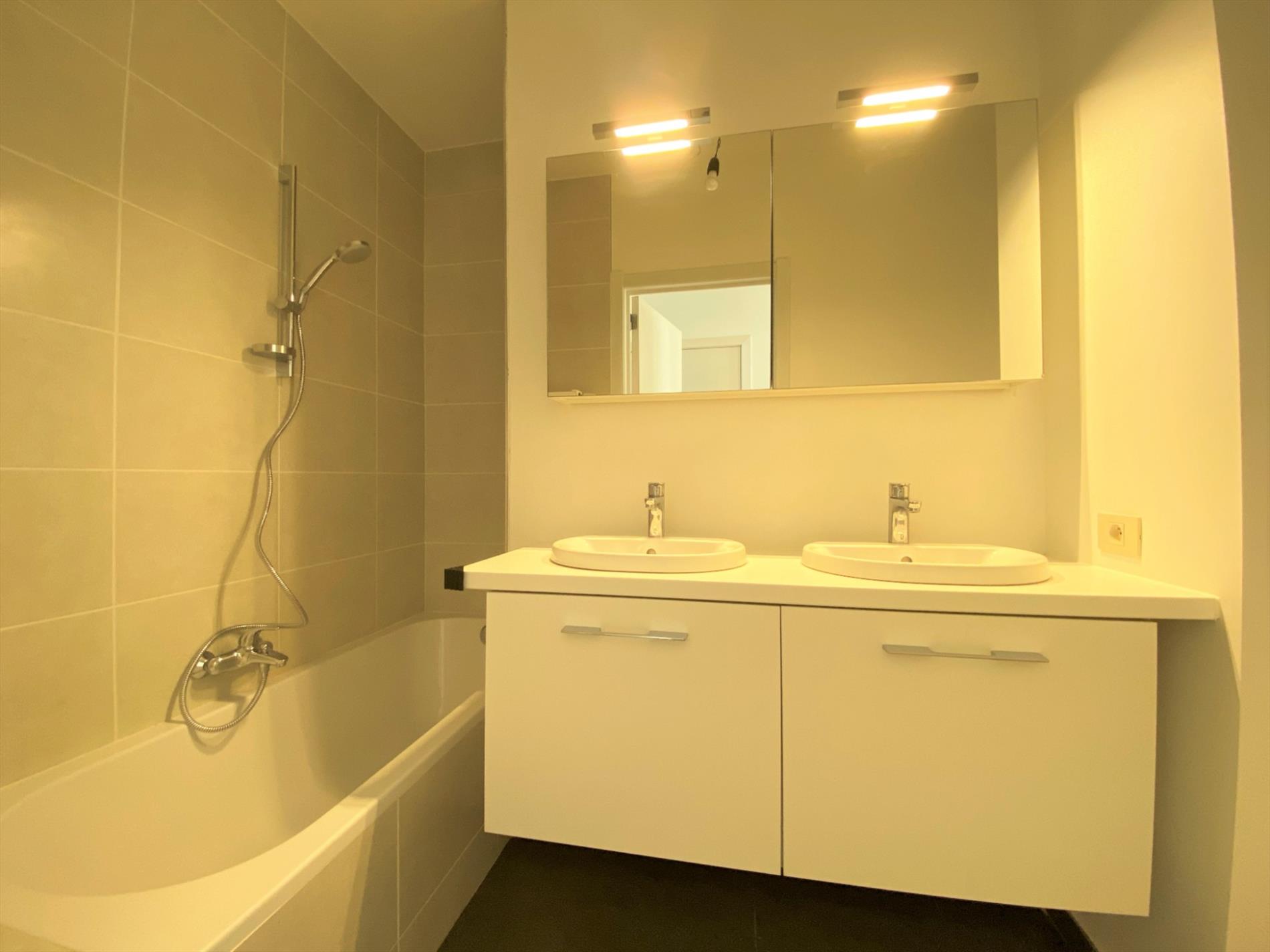 De badkamer is voorzien van een dubbelvoudige lavabo en ligbad met douche mogelijkheid.