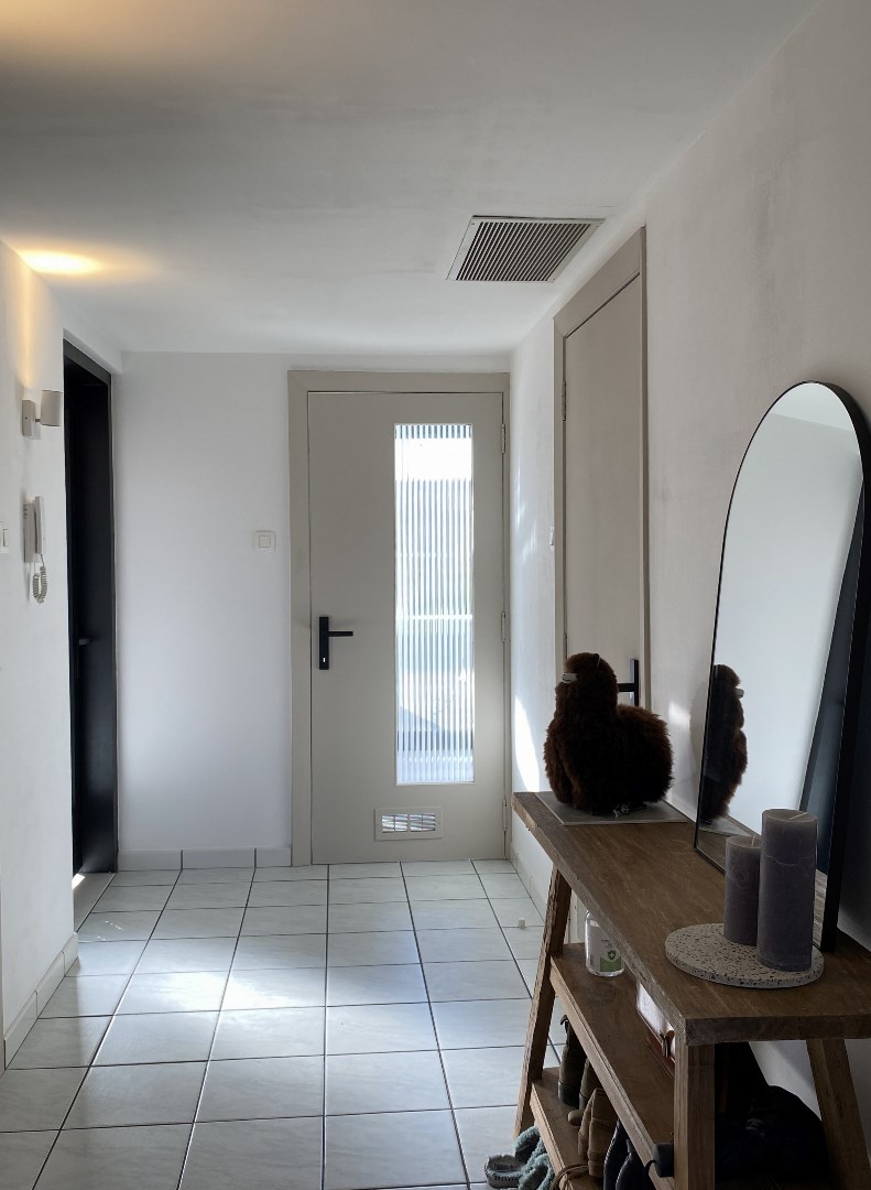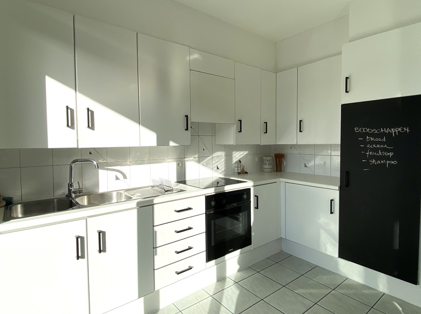 Bij het binnenkomen leidt de inkomhal u naar de ruime leef- en eetruimte, waar de grote raampartijen zorgen voor een overvloed aan natuurlijk daglicht. Hier vindt u ook de gashaard die de ruimte extra gezellig maakt. De open keuken is volledig uitgerust met een koelkast | dubbele spoelbak | kookplaat | dampkap en oven, deze sluit aan op de leefruimte. Via de keuken heeft u ook toegang tot het zonnige terras.