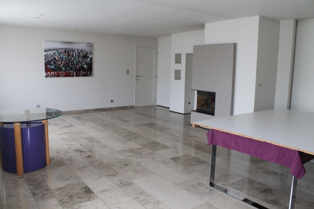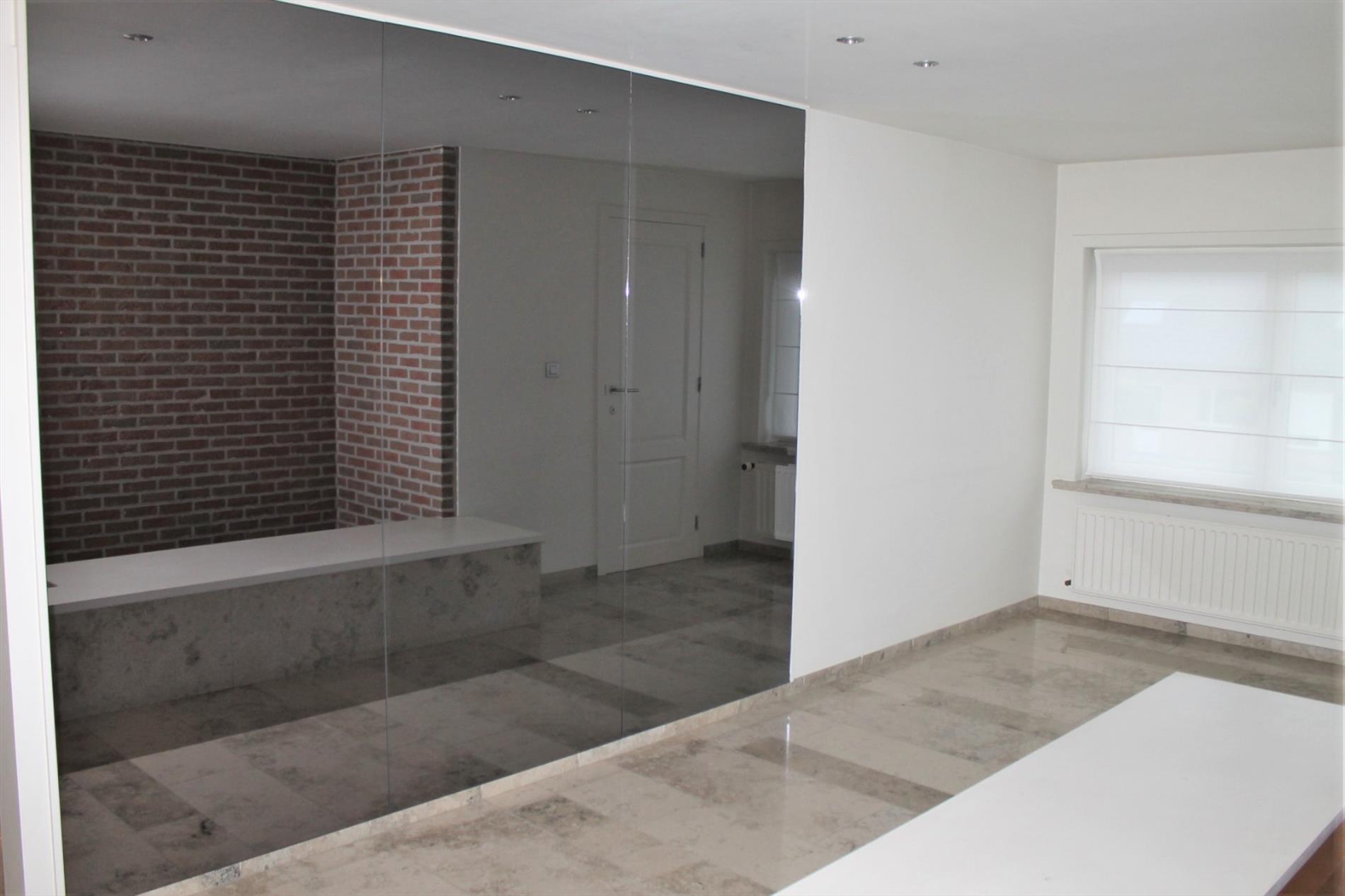 De verdieping omvat een inkomhall met gastentoilet, ruime leefruimte met open haard. Via de dubbele schuifdeur hebt U directe toegang tot de volledig ingerichte keuken. De keuken heeft directe toegang tot het ruime private terras.
