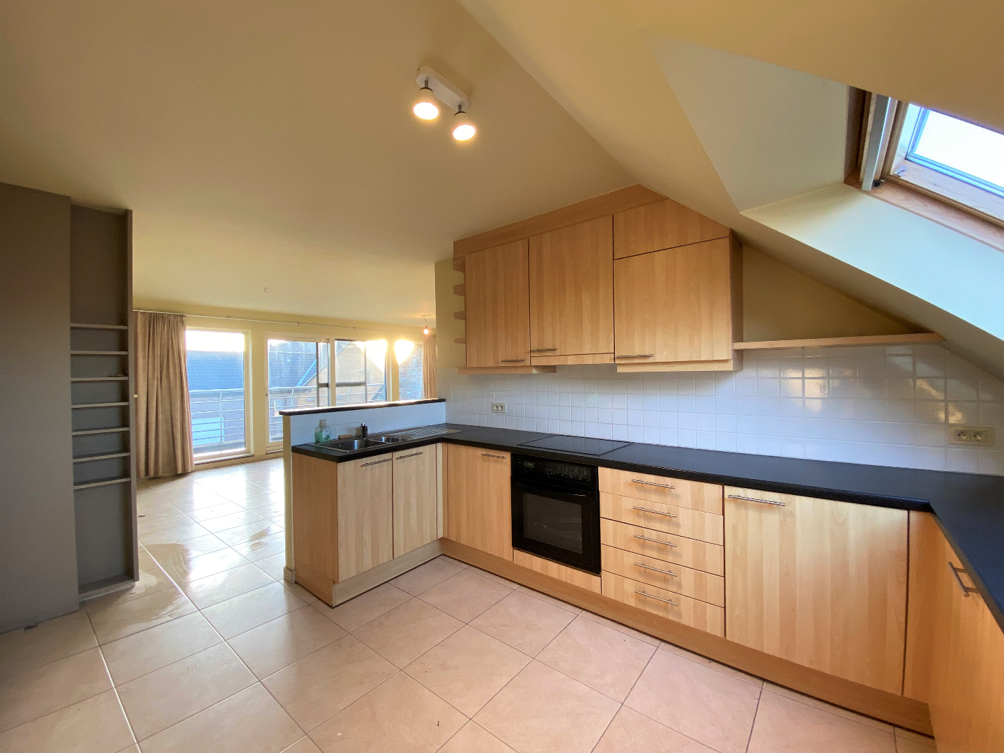 De keuken omvat een oven | spoelbak | kookplaat | dampkap. In de keuken is ook de aansluiting voor de wasmachine.