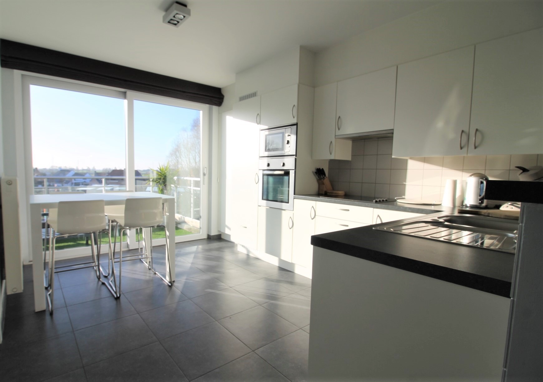 Keuken is voorzien van alle comfort en omvat een kookplaat, dampkap, spoelbak, koelkast, oven en microgolf.