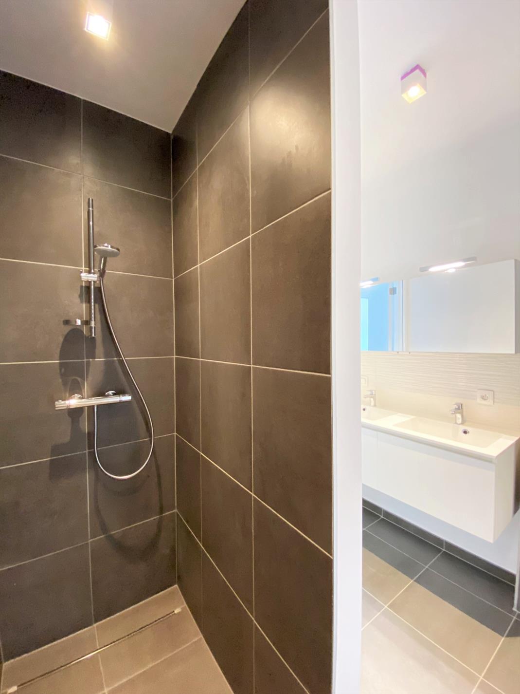 De badkamer bestaat uit een inloopdouche, een lavabo en een toilet.