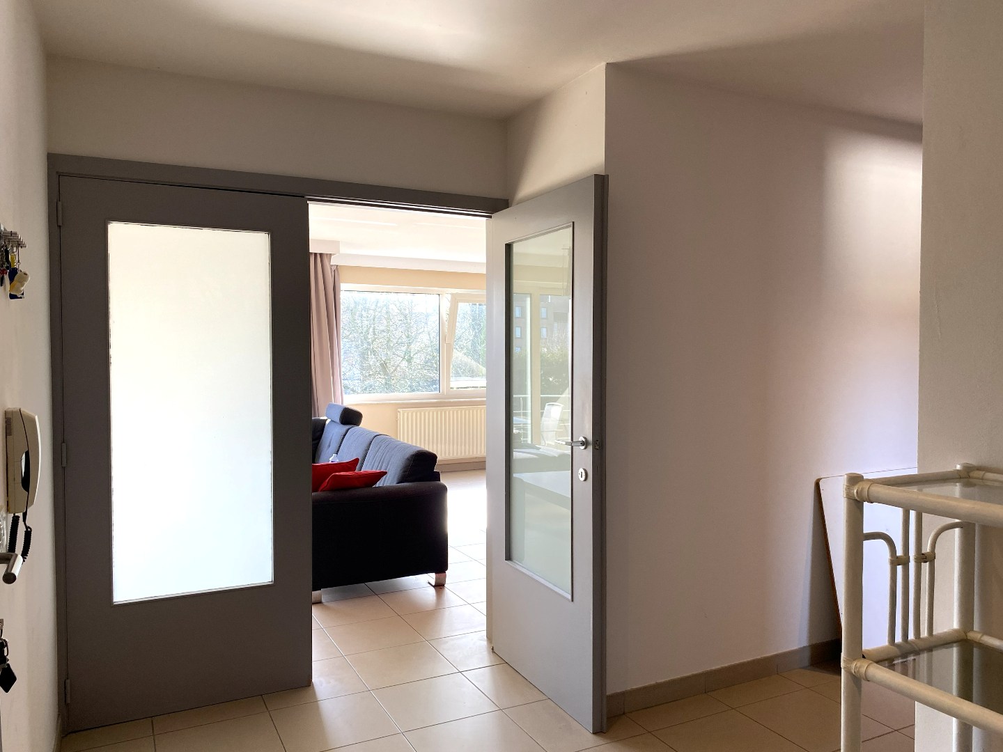 U komt binnen in de inkomhal die toegang verleent tot alle ruimtes. Via een dubbele deur betreedt u de lichtrijke leefruimte. Verder heeft U de gesloten ingerichte keuken (elektrische kookplaat, oven, dampkap, dubbele spoelbak en koelkast). Aansluitend heeft dit appartement een praktische berging met aansluiting voor een wasmachine. Via de leefruimte kan u het zongericht terras betreden.