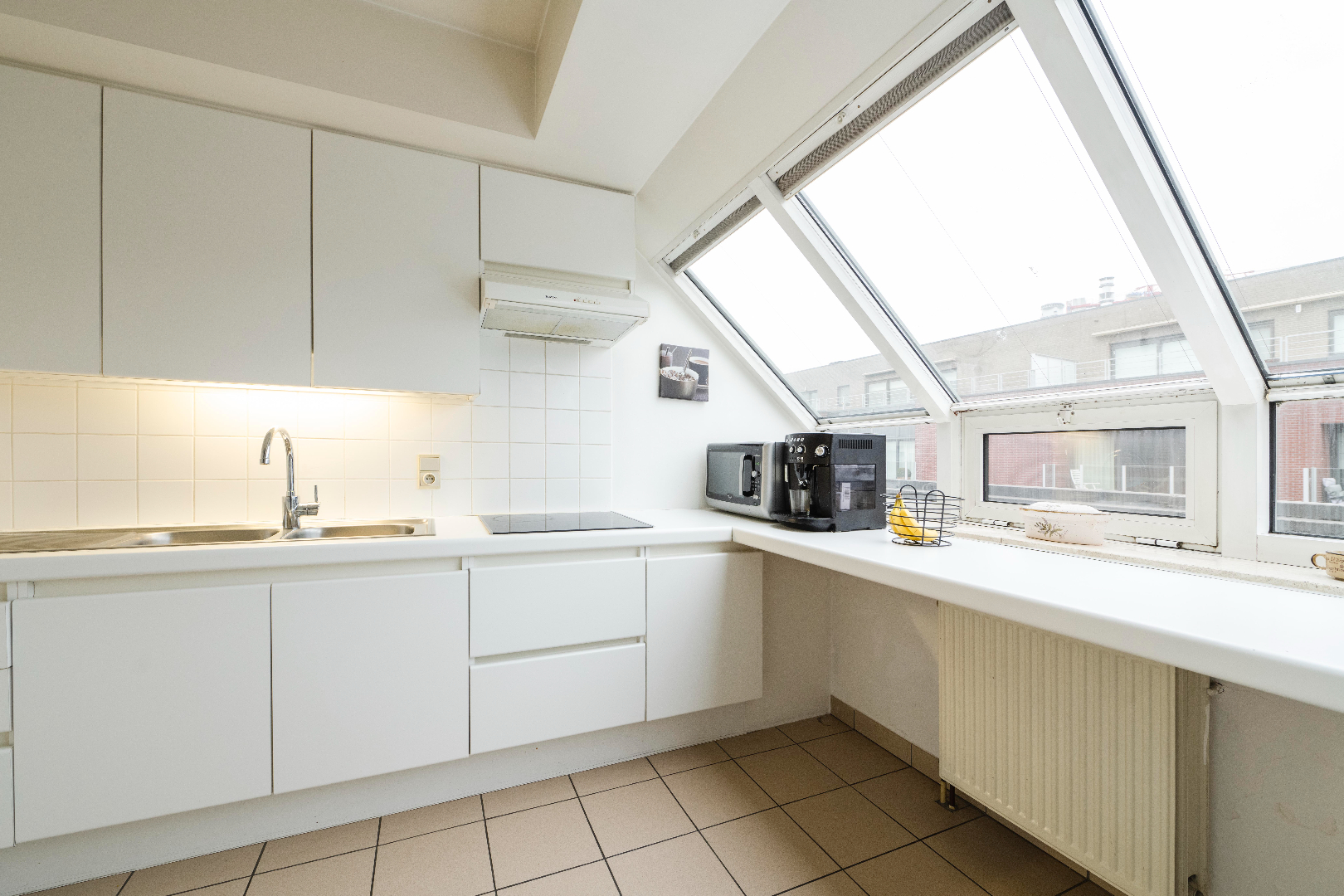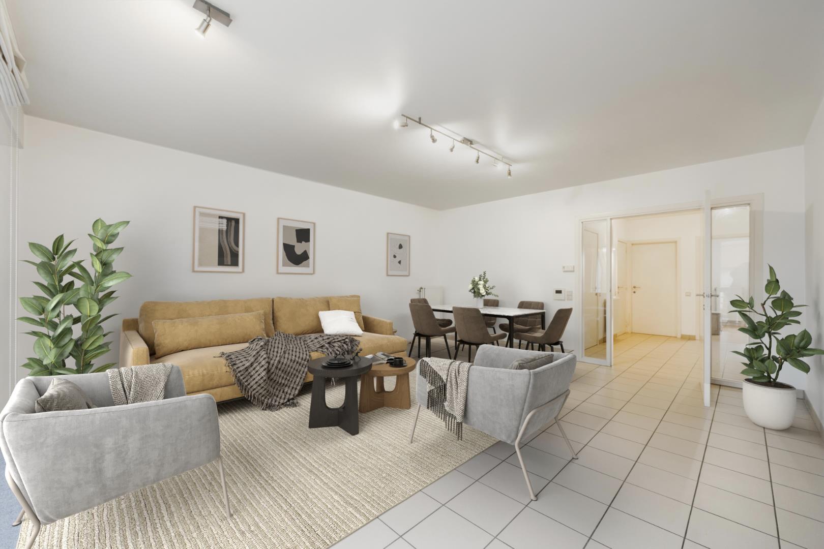 U komt de résidentie binnen via de Noordstraat, deze is voorzien van een conforme lift met trappenhal. Het eigenlijke appartement beschikt over een zeer praktische inkom (10m²) met toegang tot het gastentoilet. Via de dubbele glazen deur komt U de lichtrijke leefruimte binnen van 26,75 m² met directe toegang tot het terras aan de Noordstraat. Verder is er de half open keuken (Koelkast | microgolfoven | kookplaat | dampkap en spoelbak) met aansluitend handige koele berging (3,5 m²).