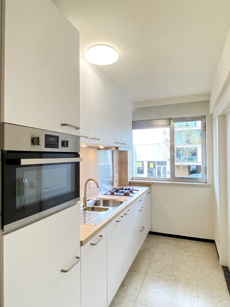 Vervolgens is er de ruime en lichtrijke leefruimte met directe toegang tot het terras aan de voorgevel. Verder is er de recente keuken voorzien van kookplaat op gas | dampkap | combi-oven | spoelbak | vaatwasmachine | koelkast met vriesvak. Naast de keuken is er een praktische bergruimte.