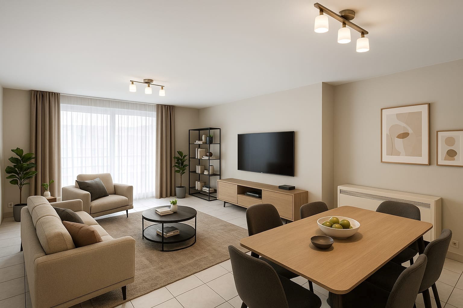 U komt binnen in de inkomhal met daarbij toegang tot het apart toilet. Vervolgens komt U terecht in de open ingerichte keuken die werd voorzien van alle comfort (dubbele spoelbak, frigo, kookplaat en dampkap). Aansluitend is de ruime leefruimte, waarbij u toegang heeft tot het eerste zongerichte terras. Er is tevens een berging aanwezig, met aansluiting voor een wasmachine.