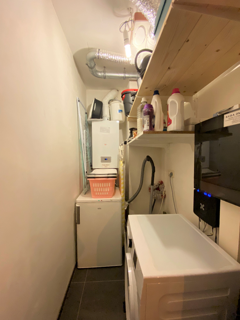 Het appartement omvat een inkomhal, een gastentoilet, een ruime leefruimte met aansluitende de open ingerichte keuken. De keuken is voorzien van een keramische kookplaat, een dampkap, een koelkast, een dubbelvoudige spoelbak en een combi microgolf-oven. Via de keuken komt men terecht in de koele berging. Tot slot telt het appartement één slaapkamer en een badkamer (douche - lavabo).