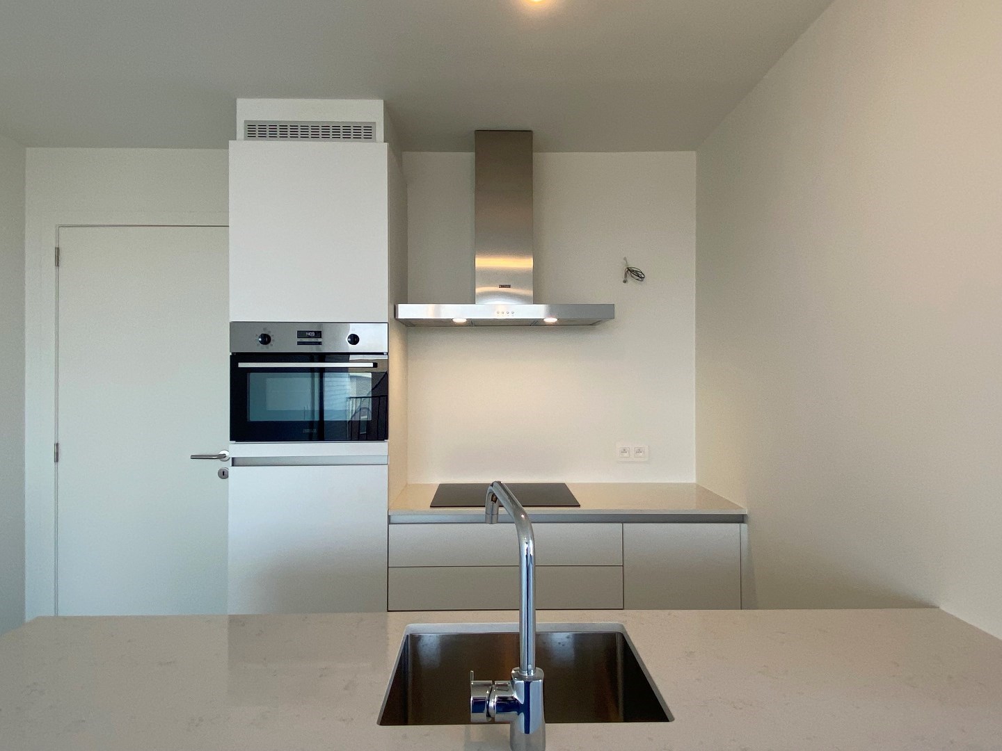 U komt binnen via de inkomhal die toegang verleent tot de bergruimte met ventilatie type D en aansluiting voor de wasmachine, toilet en leefruimte. Vervolgens komt u terecht in de lichtrijke leefruimte met volledig geïnstalleerde open keuken (combi - oven, frigo, spoelbak, vaatwasser, inductie kookplaat en dampkap). Via het schuifraam in de woonkamer is er toegang tot het terras.