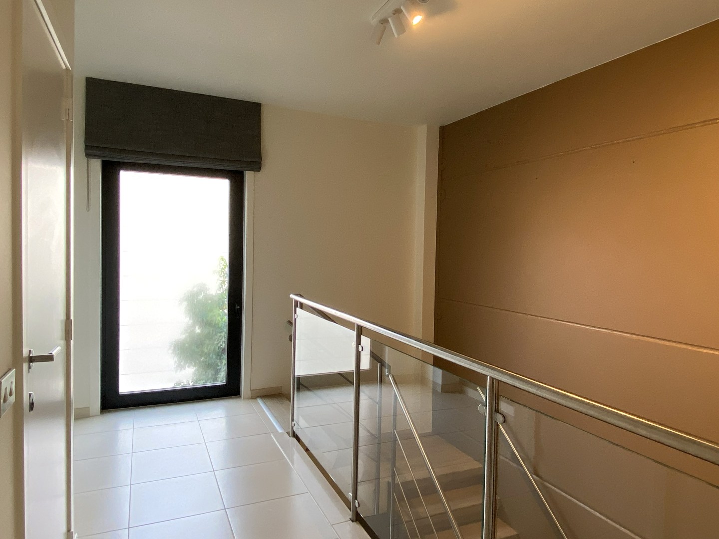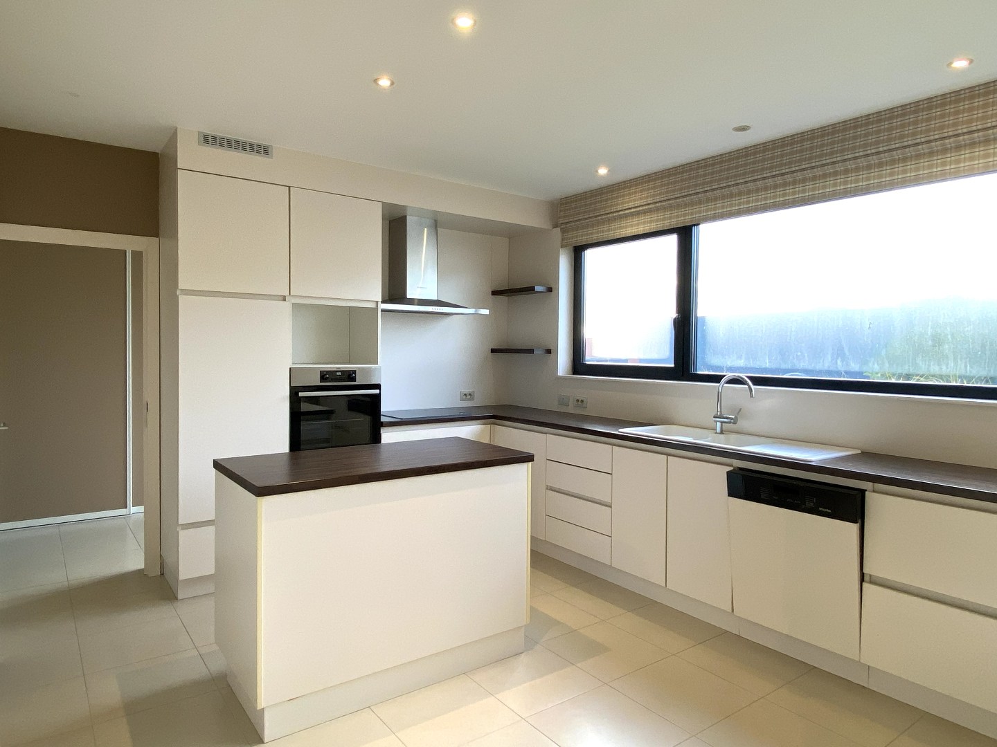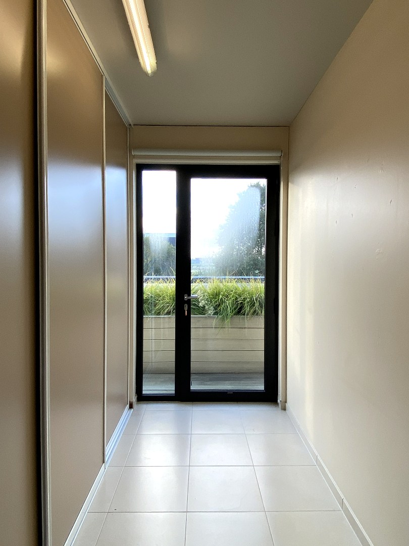U beschikt over een aparte inkomhall met berging en trap naar het eerste verdiep. U komt het appartement binnen via de ruime inkom met gastentoilet. Verder is er de lichtrijke leefruimte die toegang verleent tot het terras. Naast de leefruimte kan u via een schuifdeur het bureel betreden. De ingerichte keuken is uitgerust met een dubbele spoelbak, vaatwasser, frigo, oven, keramische kookplaat en dampkap. Handig is de aansluitende berging (ruimte voor installatie van wasmachine en droogkast). Langs hier kan u eveneens het terras betreden.