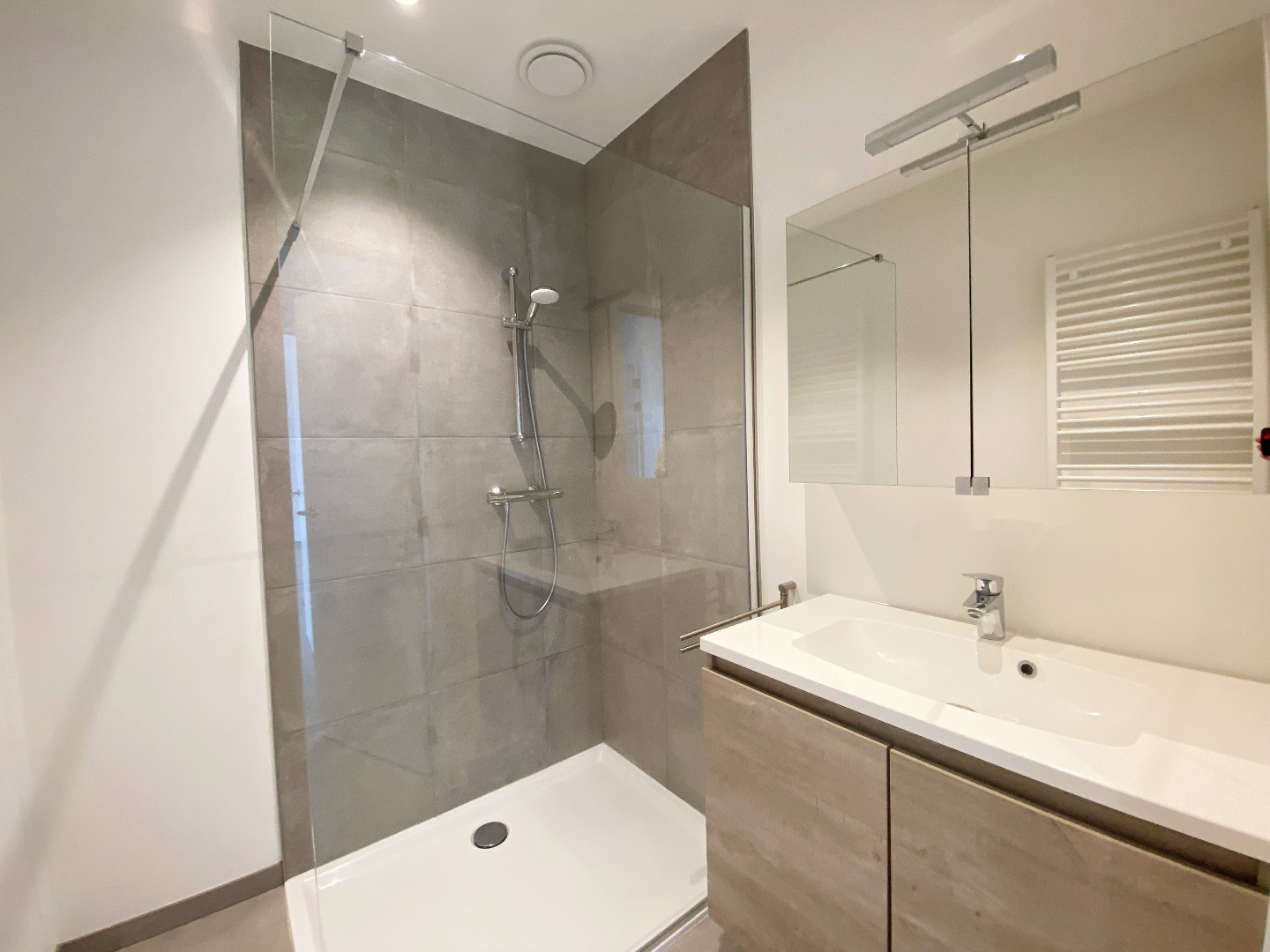 De badkamer bestaat uit een inloopdouche & een lavabo in meubel