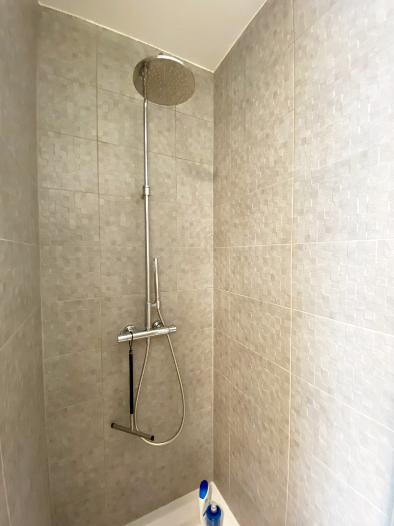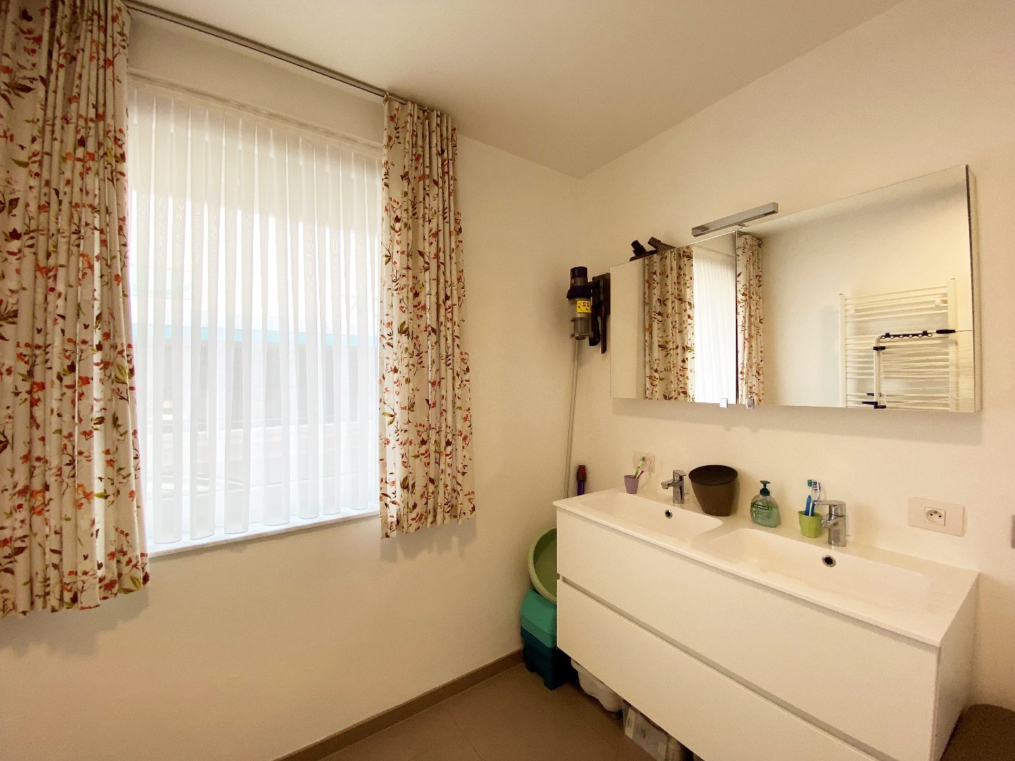 Via de inkomhal komt U ook terecht in de twee slaapkamers en de badkamer. De badkamer is voorzien van een dubbelvoudige lavabo met meubel en een douche.