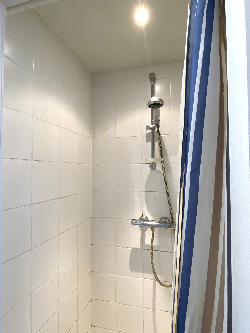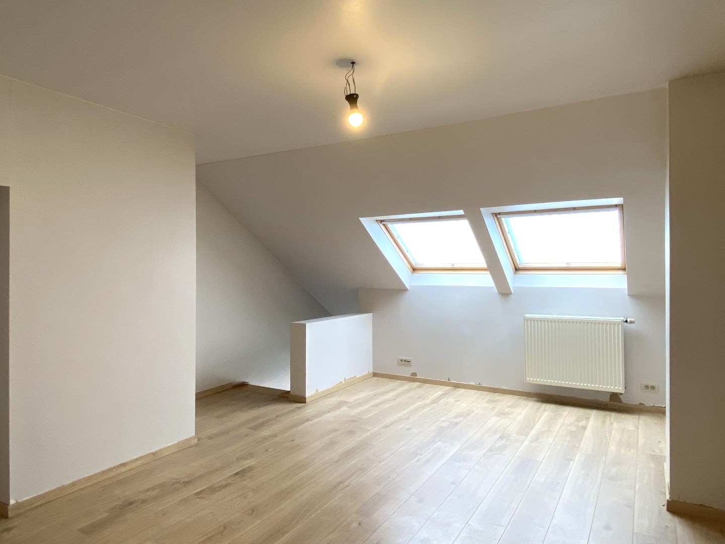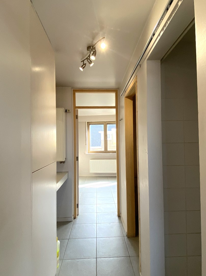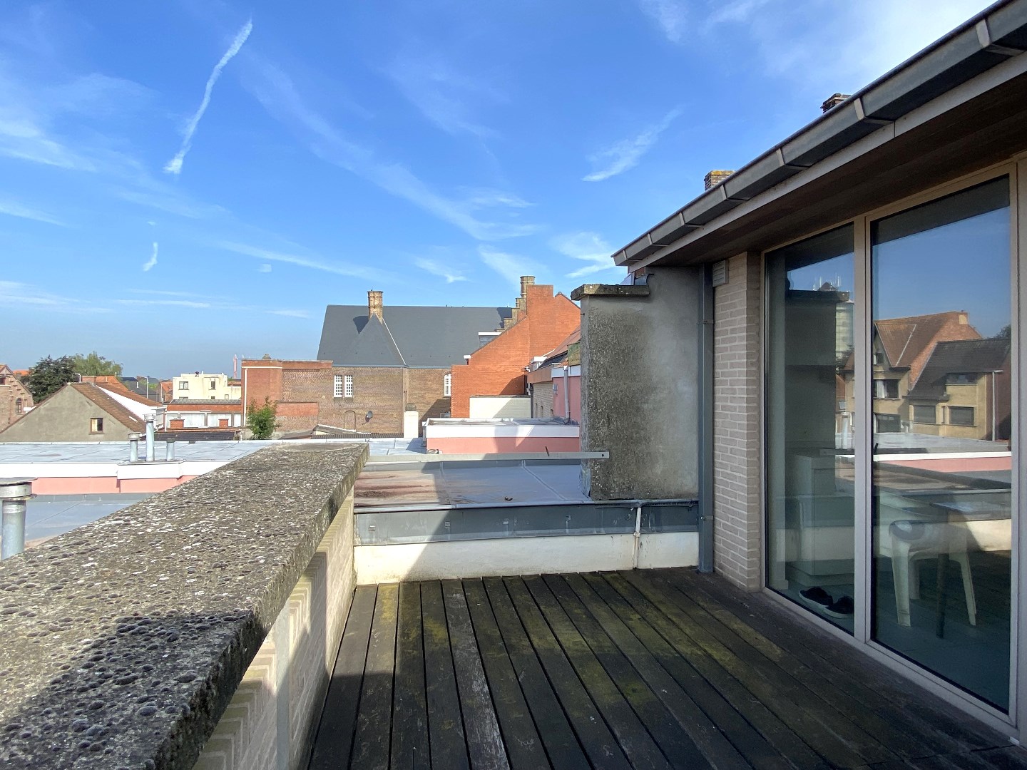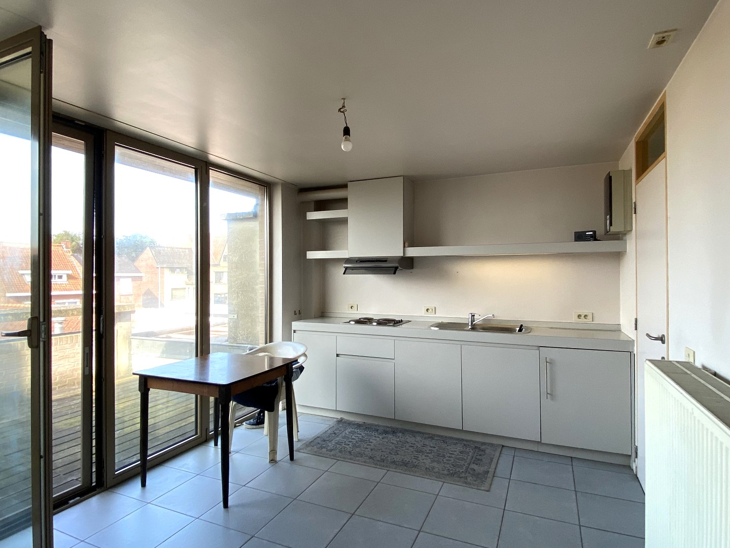 Dit appartement omvat een keuken met kookplaat, spoelbak en frigo. Via de keuken kan u het ruim terras betreden. Verder omvat het appartement een slaapkamer en een badkamer met lavabomeubel, douche en toilet. Via een vaste trap kom je terecht in de ruime leefruimte.