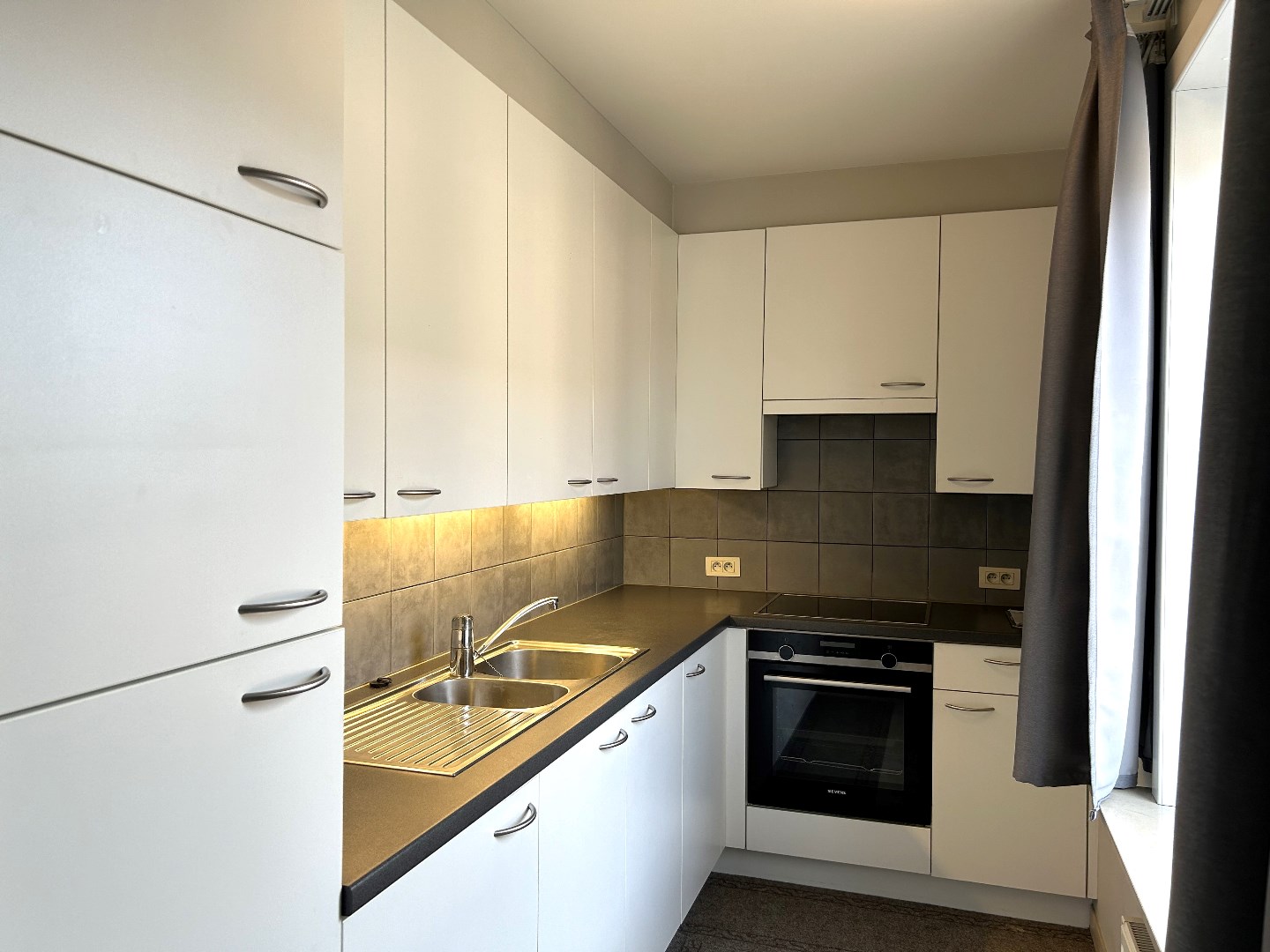 Het appartement omvat een inkomhal met tal van inbouwkasten, een ruime lichtrijke leefruimte met toegang tot het zonnig balkon. Verder is er een geïnstalleerde keuken aanwezig (frigo | inductie kookplaat | dampkap | oven).