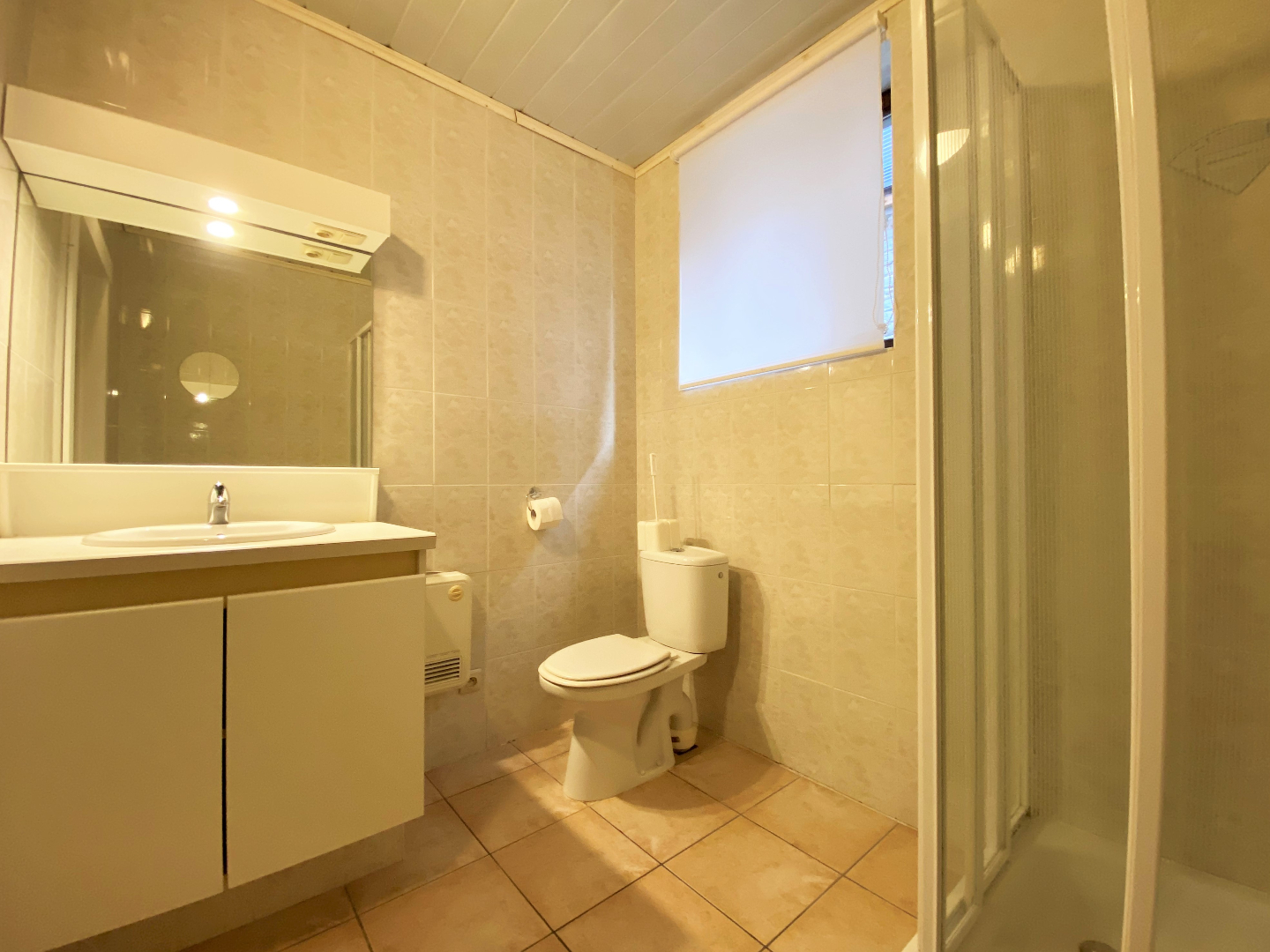 De badkamer is voorzien van een douche, lavabo en toilet. Verder in het appartement zijn er nog 2 slaapkamers. Het platte dak van de grootste slaapkamer werd opnieuw voorzien van isolatie!
