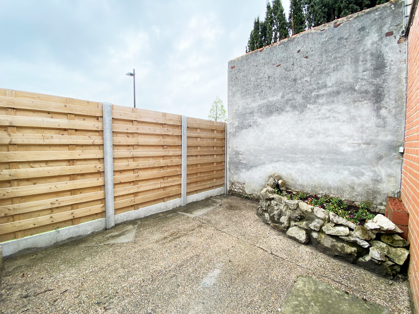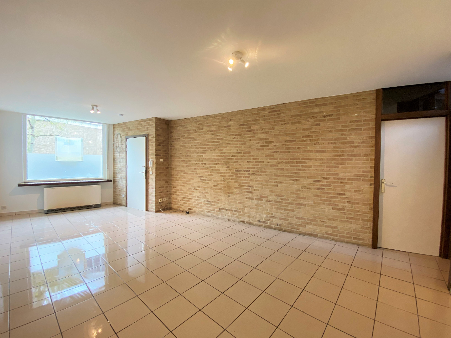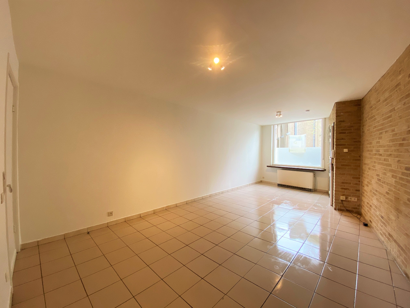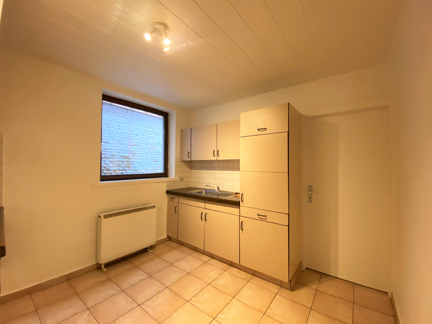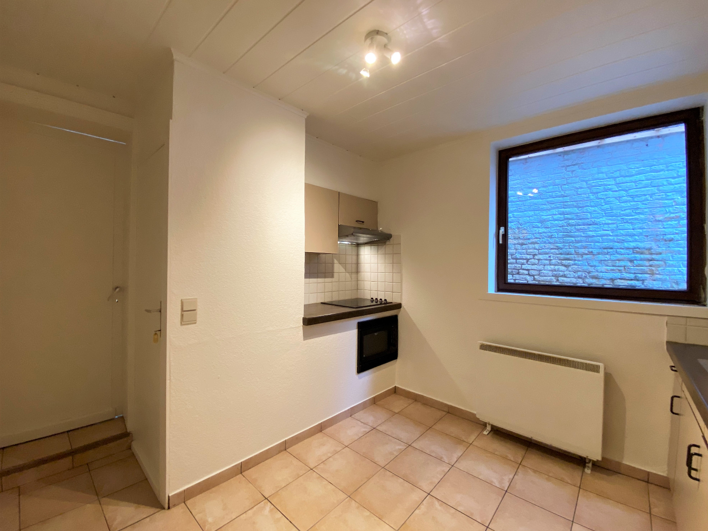U komt binnen via de woonkamer. De woonkamer kijkt uit op het kerkplein. Naast de woonkamer bevindt zich een praktische berging. De gesloten keuken is geïnstalleerd met een ingebouwde koelkast, elektrische kookplaat, dampkap en microgolfoven. Via de keuken kan u de ruime kelder betreden.