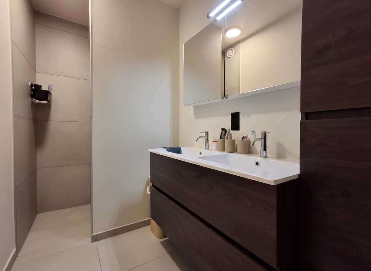 De nachthal leidt naar een gastentoilet met handwasser, twee volwaardige slaapkamers, vooraan voorzien van lamellen verduistering en een praktische technische berging met aansluiting voor wasmachine, droogkast en een handige uitgietbak. De stijlvolle badkamer is uitgerust met een inloopdouche en dubbele lavabo met spiegel- en opbergkasten.