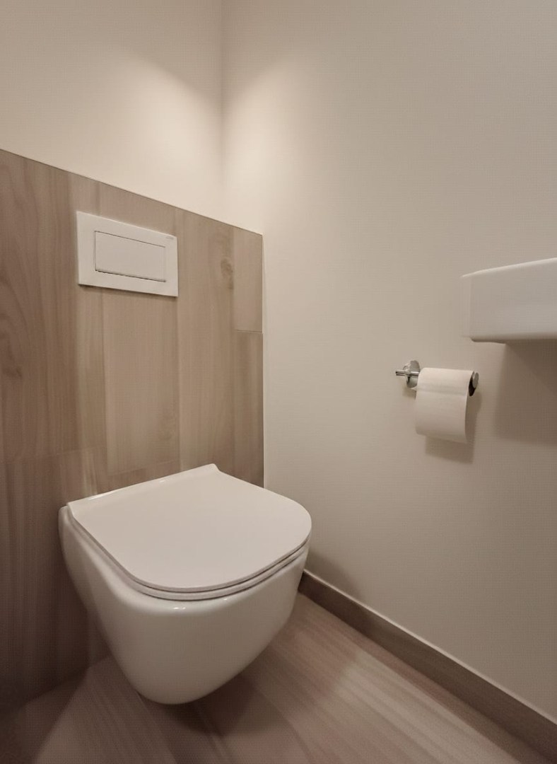 De nachthal leidt naar een gastentoilet met handwasser, twee volwaardige slaapkamers, vooraan voorzien van lamellen verduistering en een praktische technische berging met aansluiting voor wasmachine, droogkast en een handige uitgietbak. De stijlvolle badkamer is uitgerust met een inloopdouche en dubbele lavabo met spiegel- en opbergkasten.