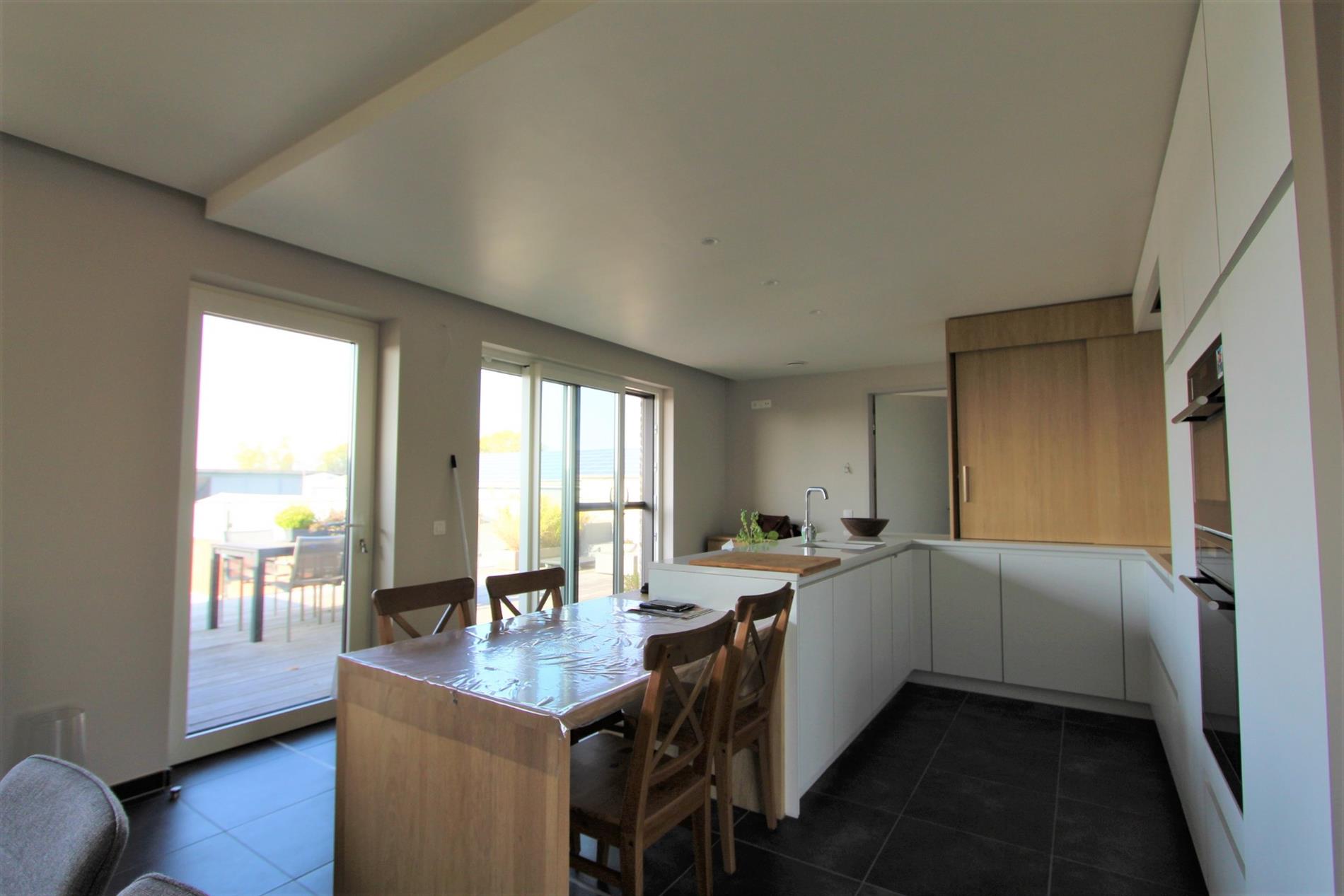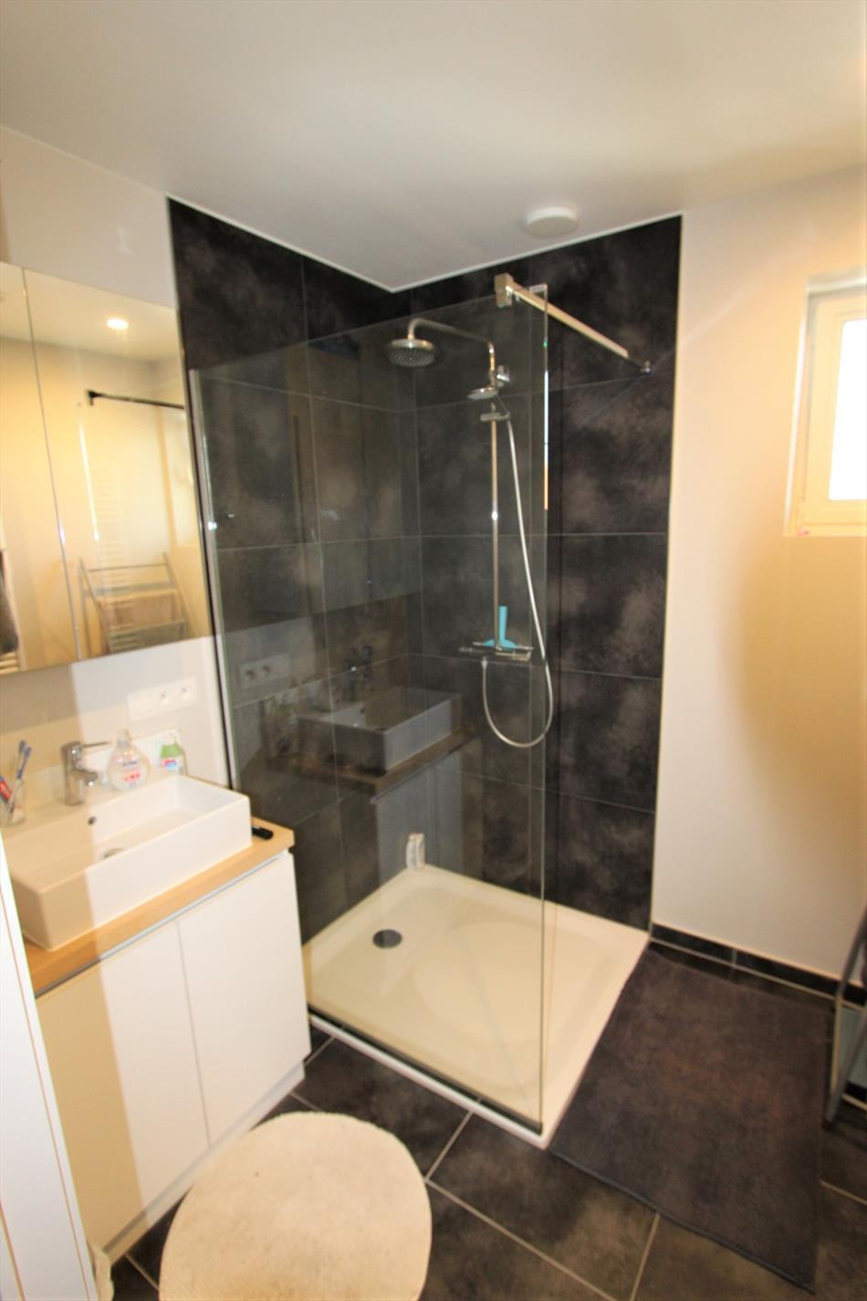 De duplex is gelegen op het eerste verdiep en omvat een inkomhall met bergruimte, gastentoilet, ruime woonkamer met eetplaats en aansluitend de open, volledig ingerichte keuken. Éen slaapkamer, een badkamer (inloopdouche - lavabo), een berging en een RUIM ZONGERICHT TERRAS maken dit eerste verdiep compleet.