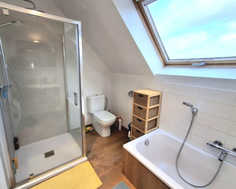 Op het tweede verdiep zijn er twee ruime slaapkamers en de badkamer. De badkamer is voorzien van douche, lavabo, bad en tweede toilet.