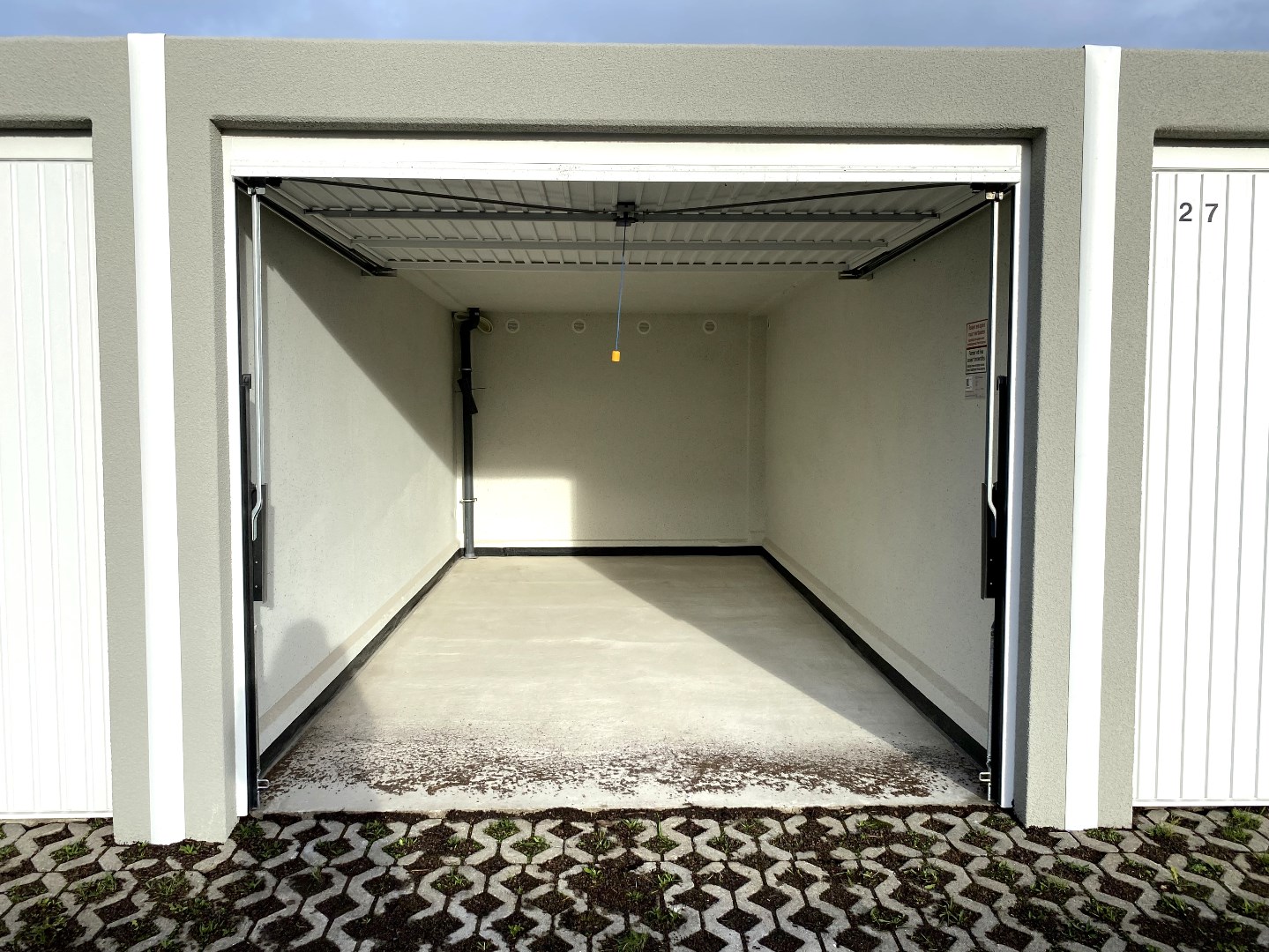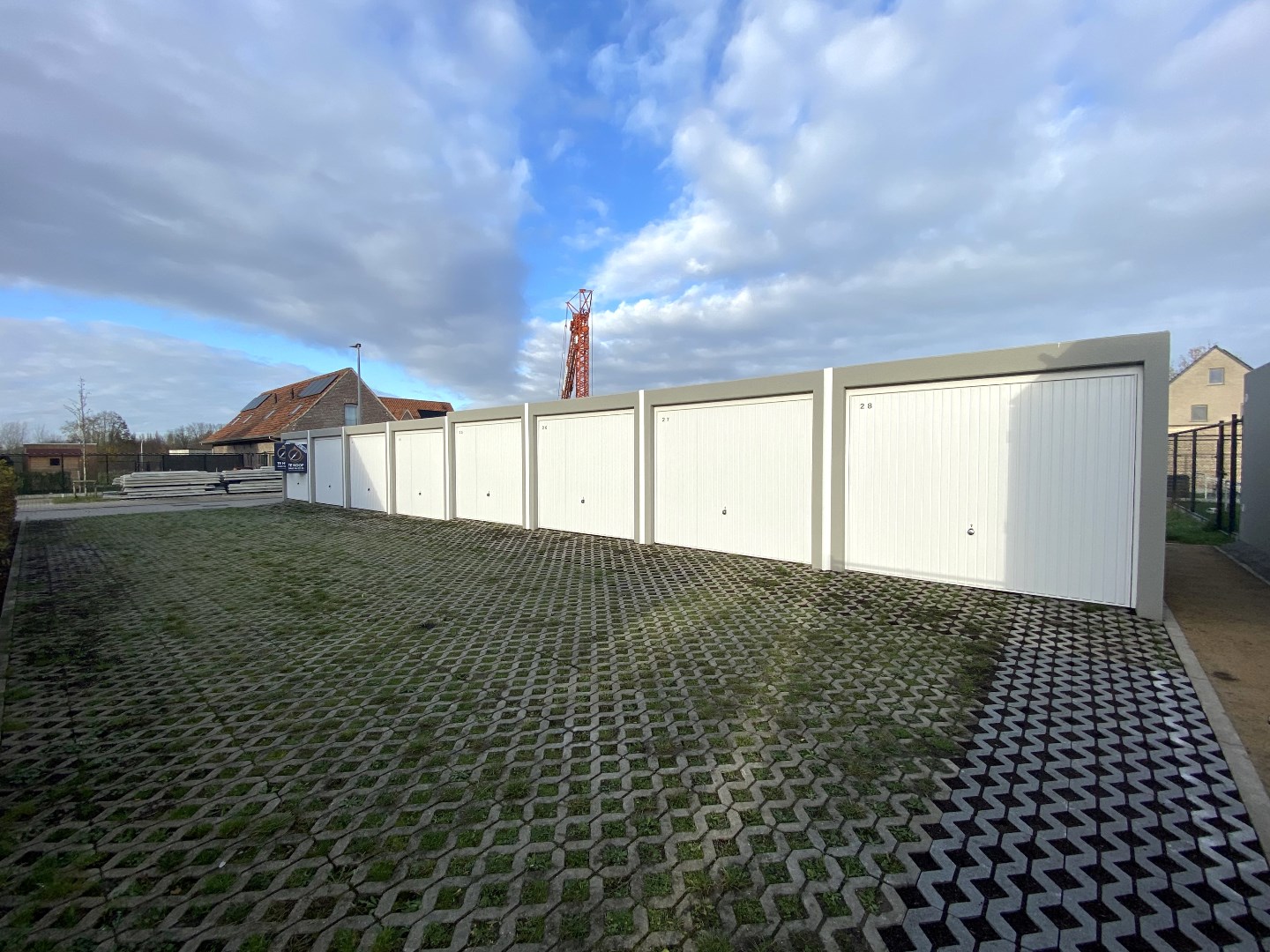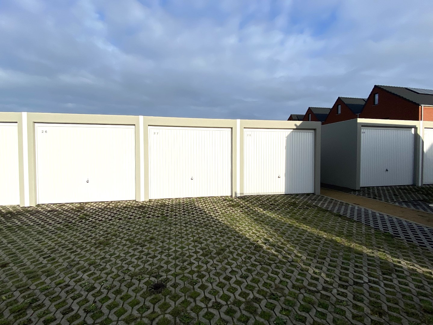 Garages te huur in Heule. Gelegen achter een reeks nieuwbouwwoningen in een nieuwe woonwijk te Heule. De garages (26 | 27) zijn vrij vanaf 15/1/2025 en voorzien van een kantel poort.