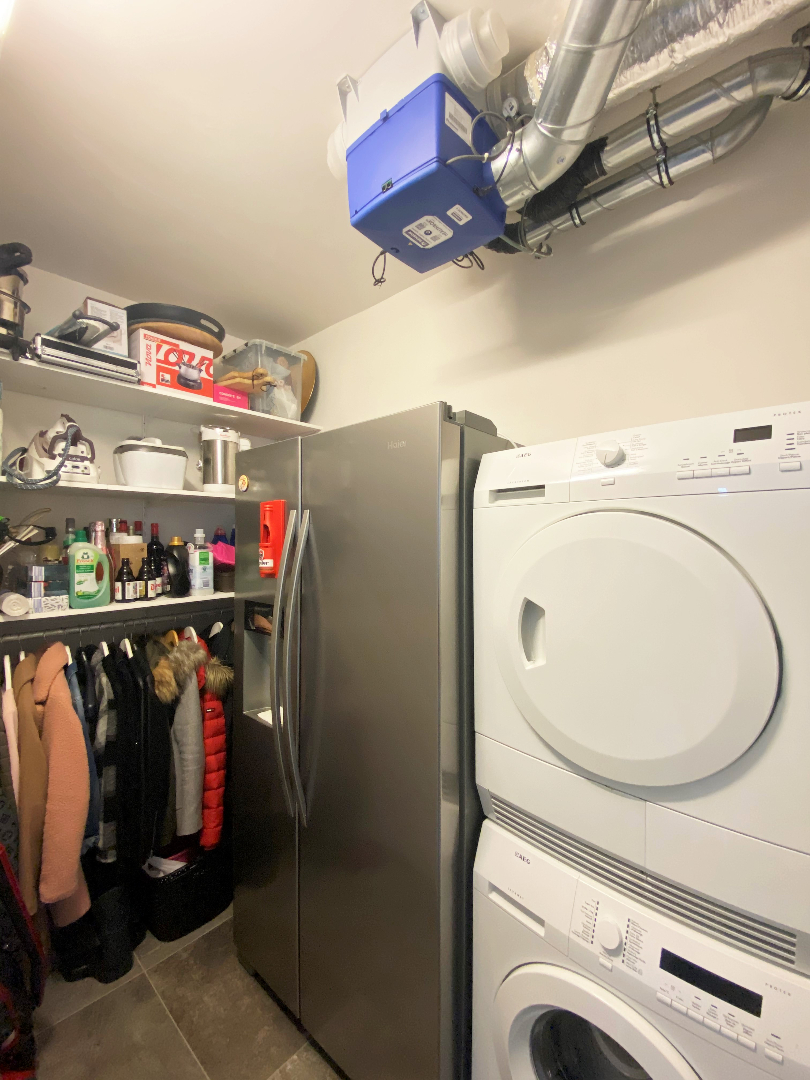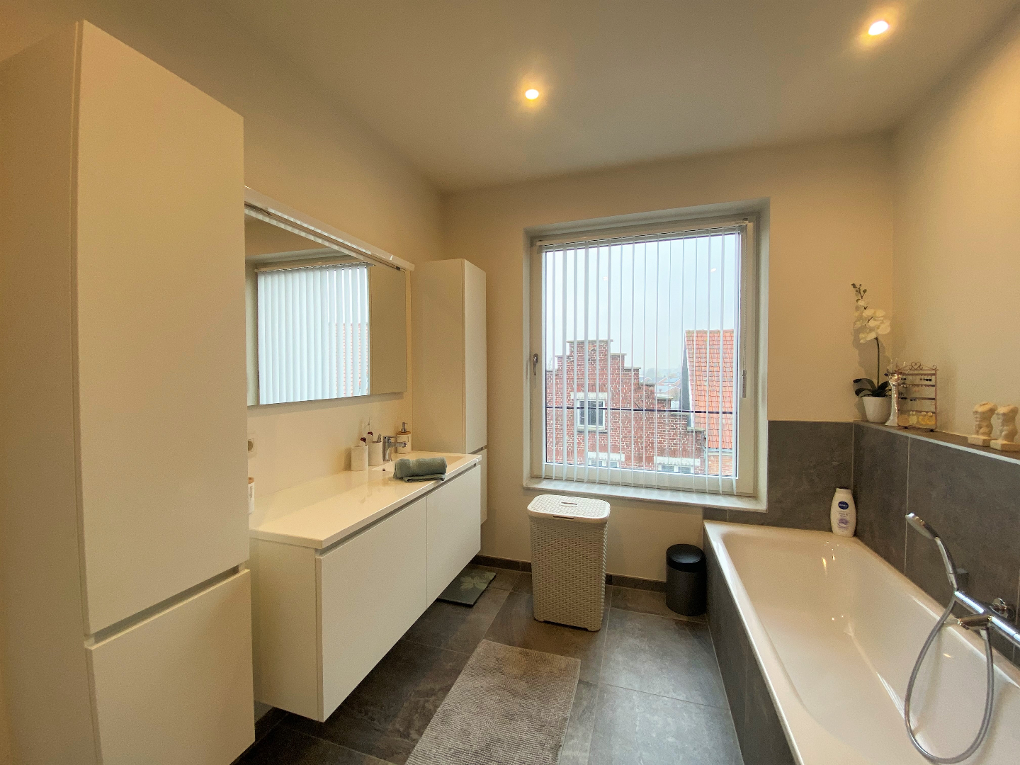 Verder omvat de penthouse een wasplaats, twee slaapkamers en een badkamer. De badkamer bestaat uit bad, douche en lavabo. De slaapkamers en de badkamer is voorzien van lamellen.