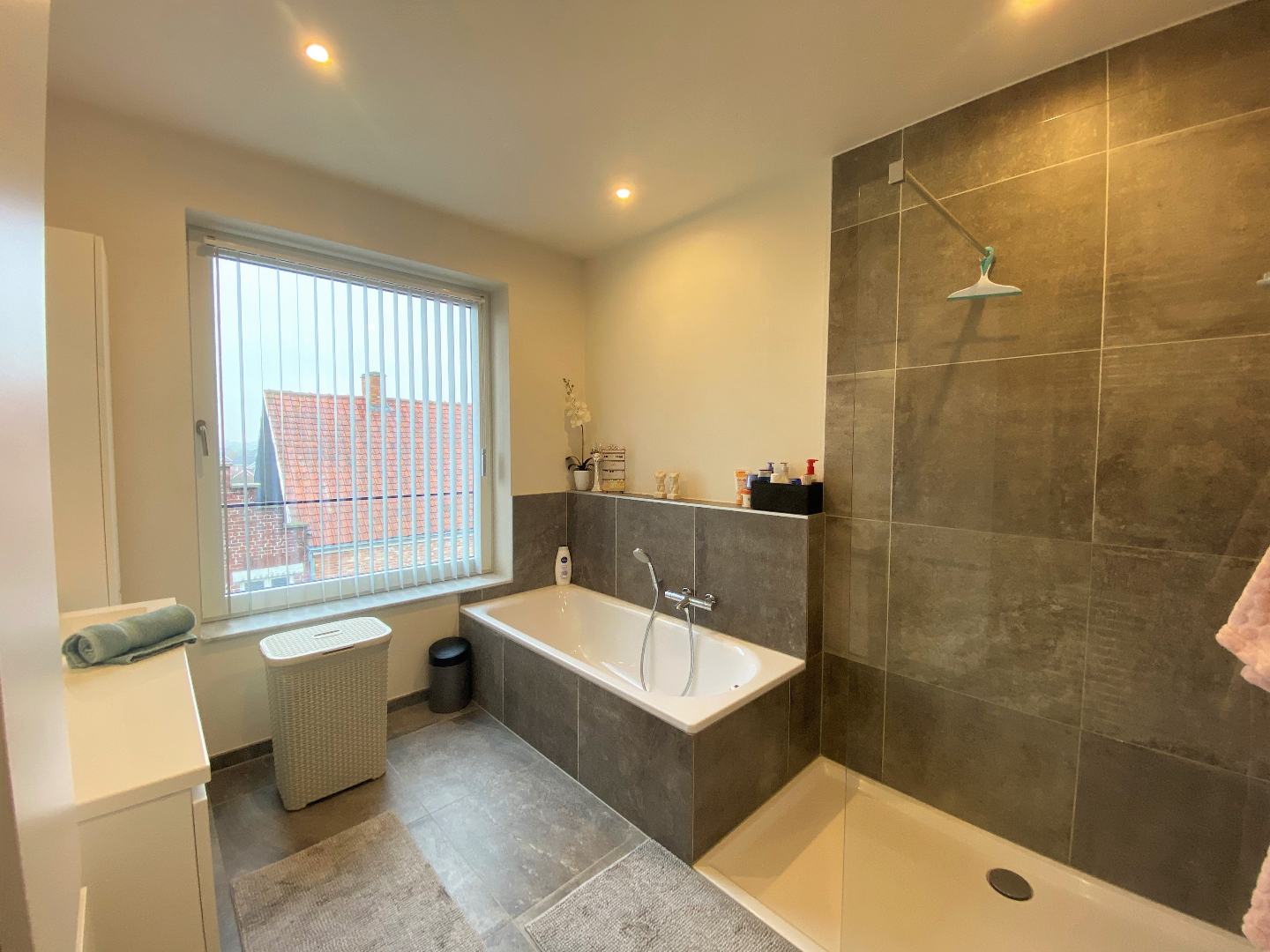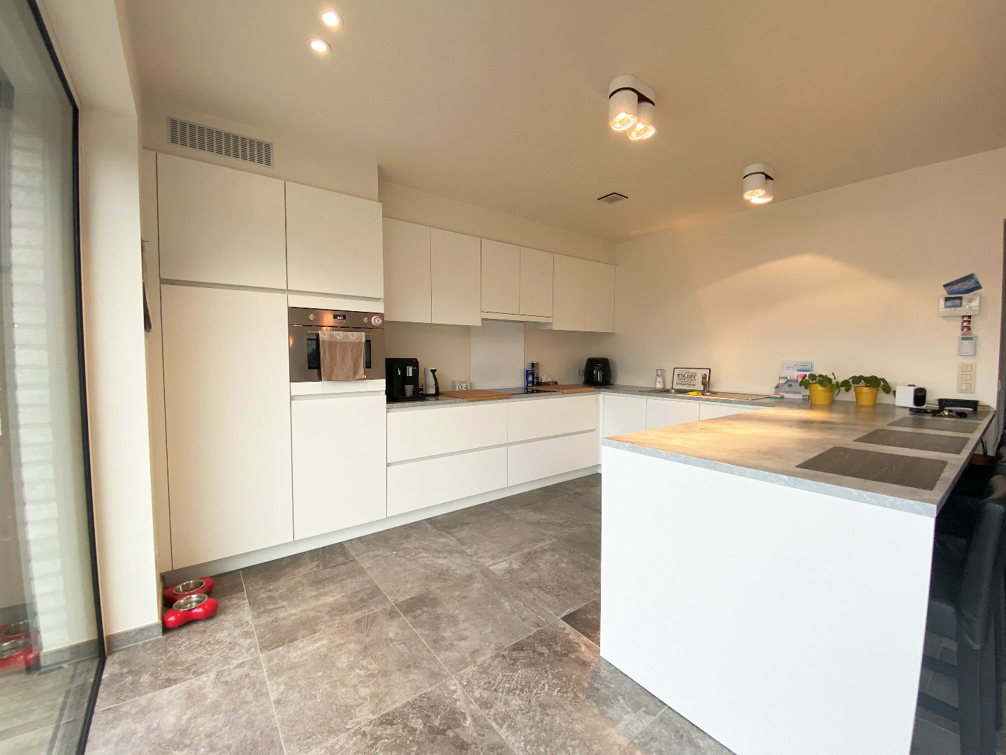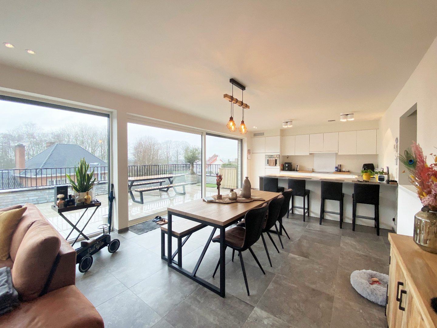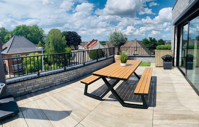 De woonst omvat een ruime inkomhal, een gastentoilet, een ruime leefruimte met aansluitend de open ingerichte en efficiënte keuken. De keuken is voorzien van alle comfort (combi-oven, dubbele spoelbak, keramische kookplaat, dampkap, koelkast en vaatwasmachine). De leefruimte is voorzien van zonnewering. Zowel de leefruimte als de keuken hebben toegang tot het prachtig ruim en zongericht terras met verzichten!