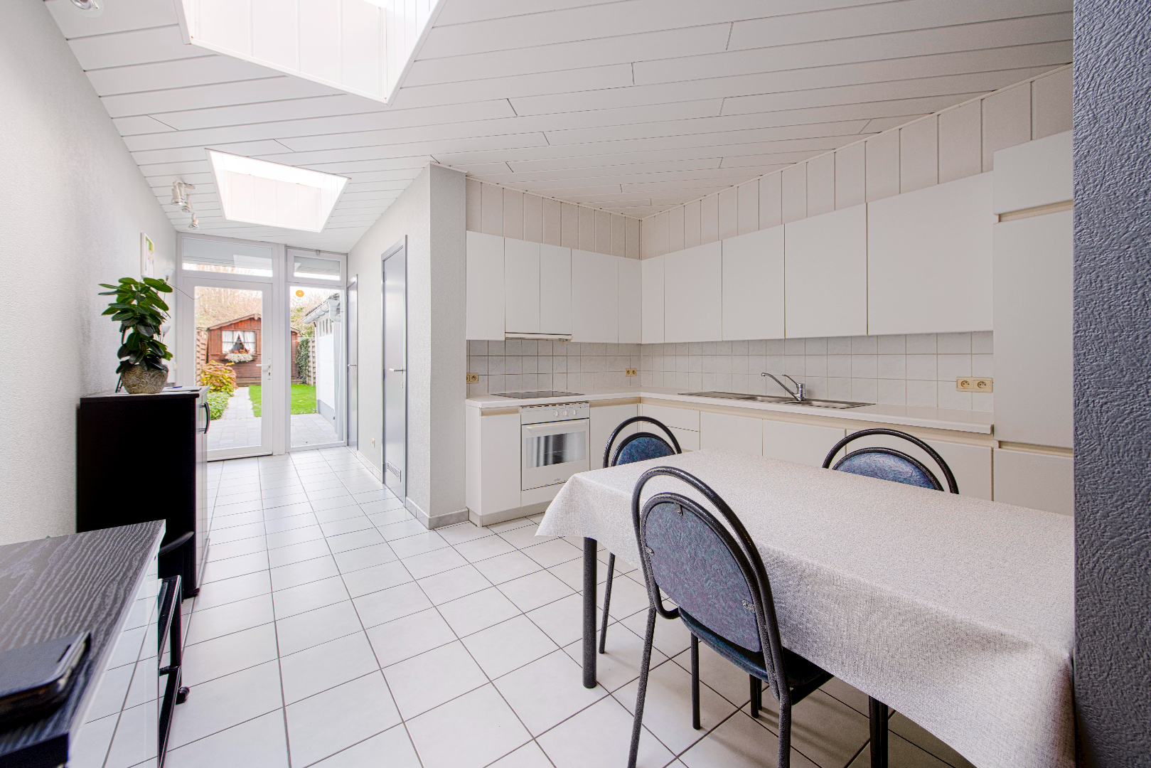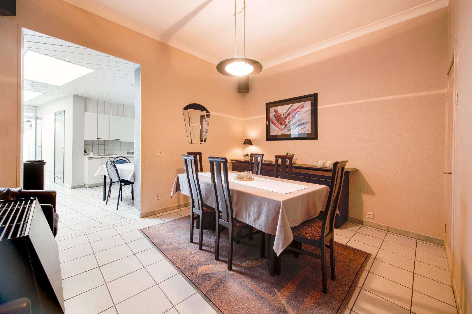 Het gelijkvloers bestaat uit de inkomhal, een gezellig zithoek alsook een ruime eetkamer. De open volledig ingerichte keuken (oven | kookplaat | dampkap | frigo | dubbele spoelbak) is een absolute meerwaarde voor deze woning. Door de dubbelwandige lichtkoepels zeer lichtrijk en tevens een directe toegang tot de tuin. Handig is de ruime droge kelder als extra stockageruimte.