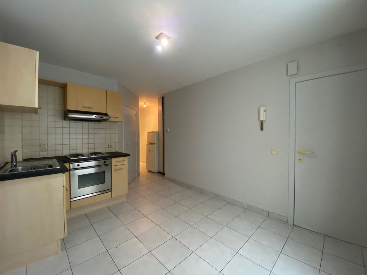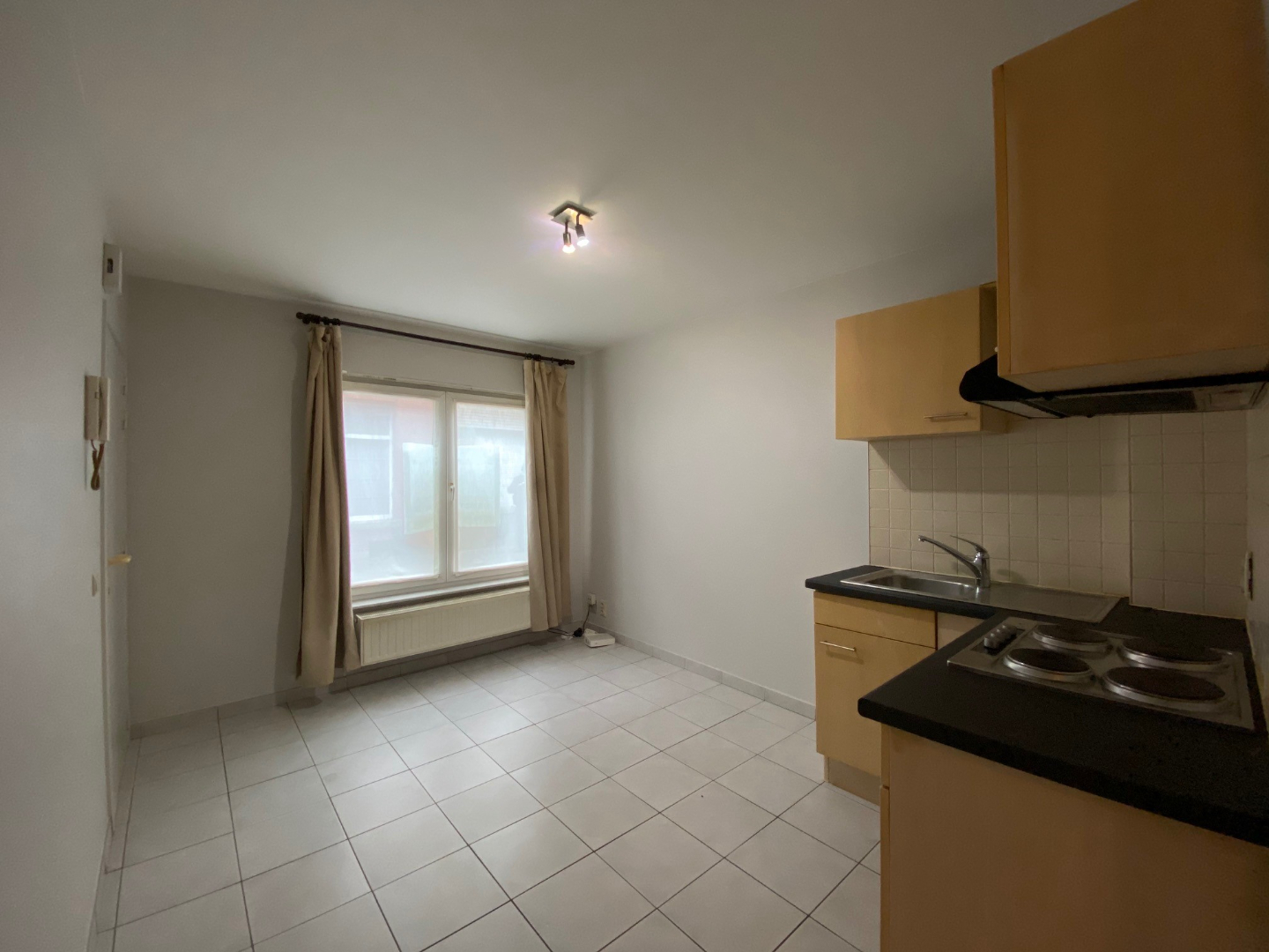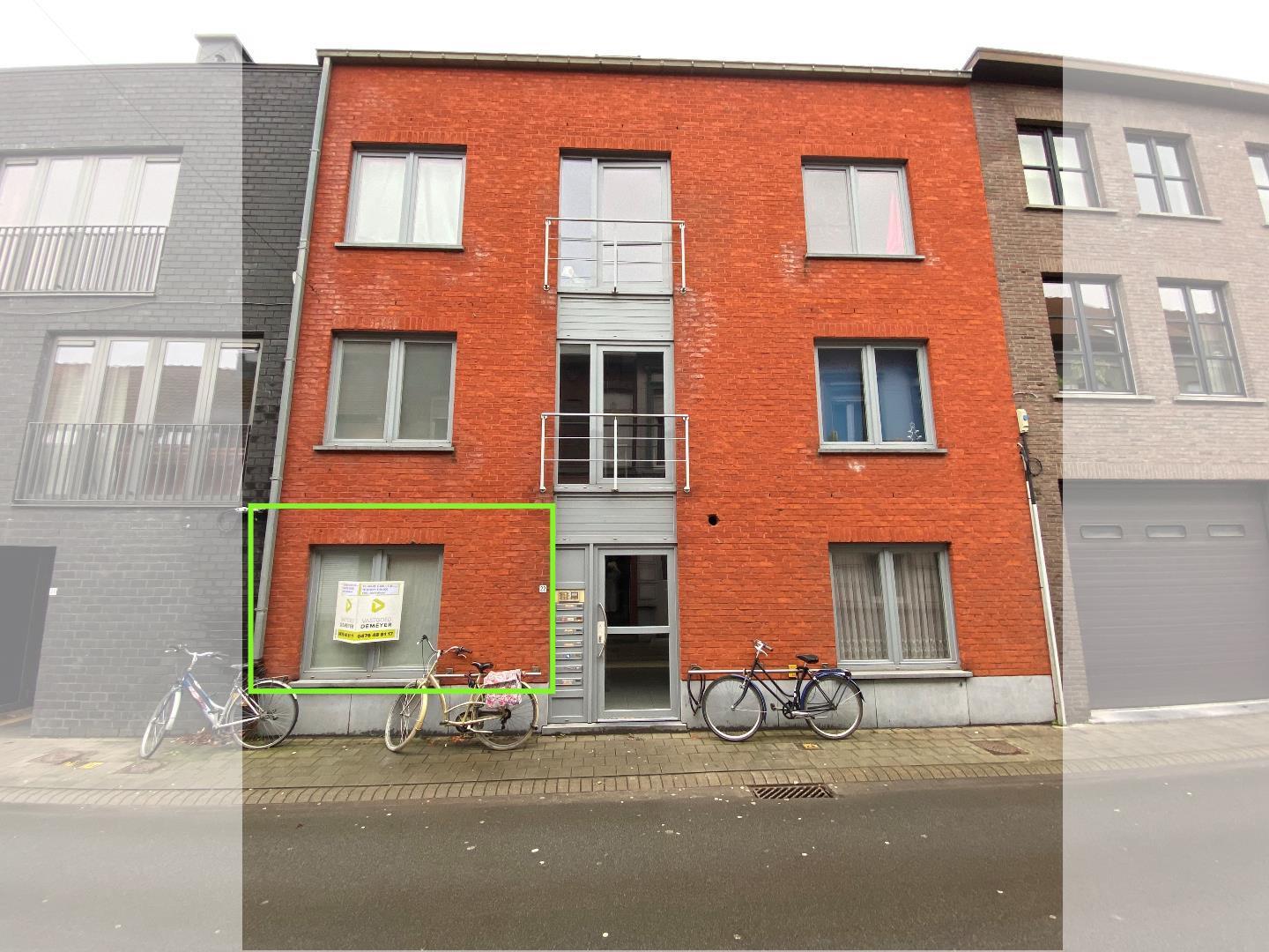 U komt binnen via de gemeenschappelijke inkomhal, aan de linkerzijde bevindt zich de inkomdeur van de studio. De studio bestaat uit de leefruimte (12 m²) met open keuken (voorzien van: spoelbak | kookplaat | dampkap | oven | frigo). Naast de keuken is er een slaapkamer (8 m²) die uitgeeft op de private koer.