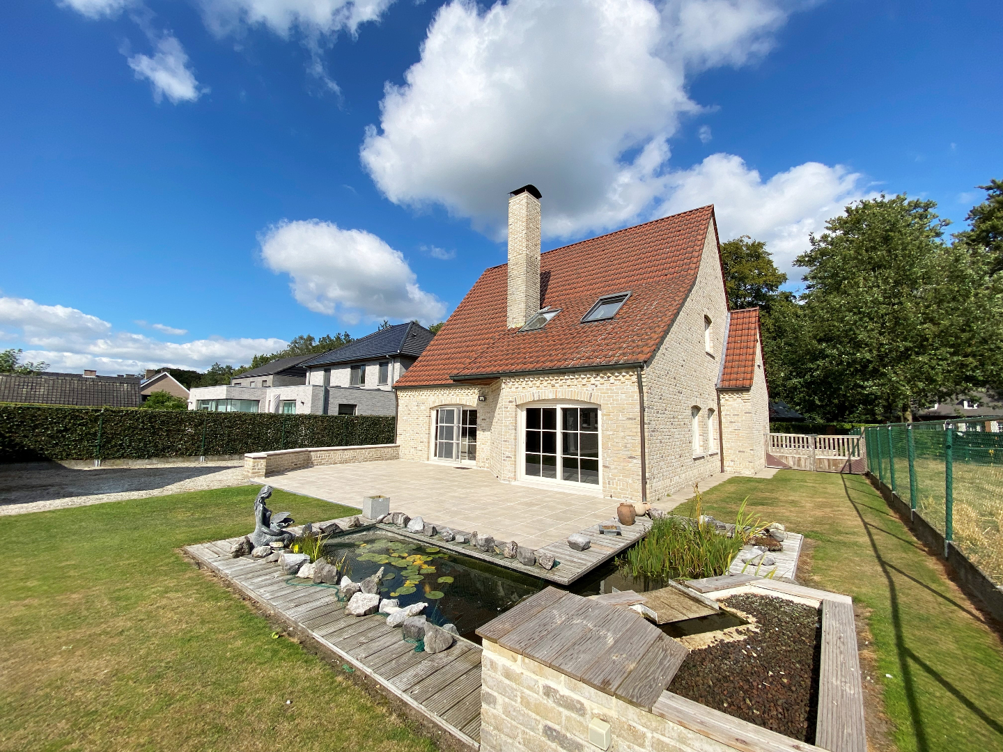 Het exterieur bestaat uit een volledig aangelegde en afgesloten tuin voorzien van een zonnig terras, visvijver, extra garage met zolderruimte en 2 tuinbergingen. Achteraan de tuin is er mogelijkheid voor een moestuin/kippenren.