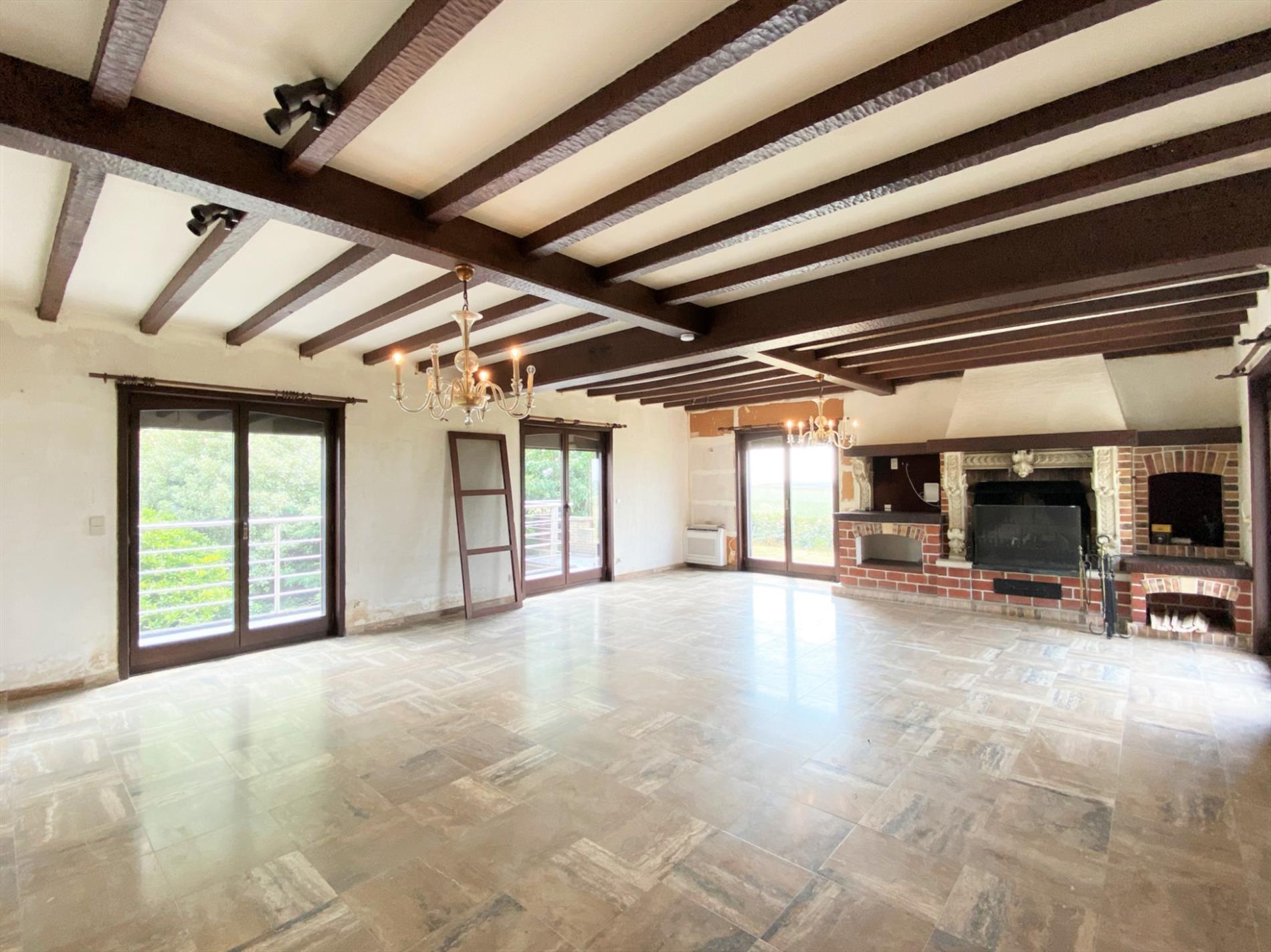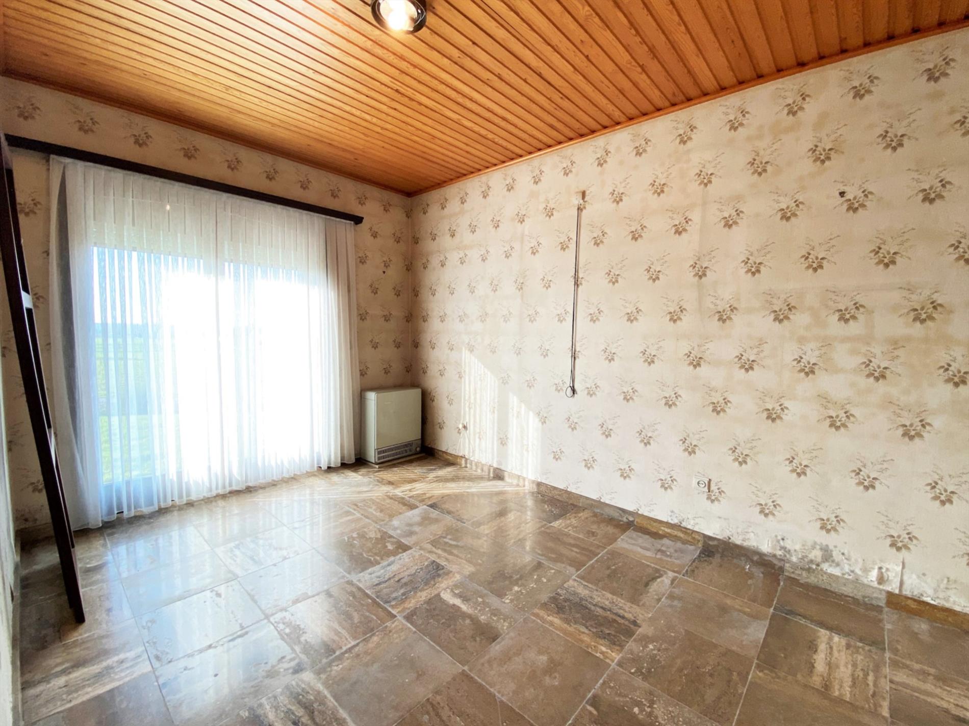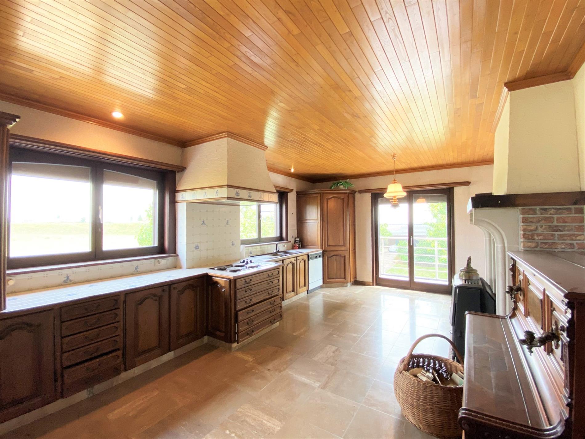 Via de ruime inkomhall komt u binnen. De dubbele glazen deur geeft toegang tot de gezellige leefruimte met open haard. De lichtrijke keuken is geïnstalleerd met volgende toestellen (elektrische kookplaat, oven, dampkap dubbel spoelbak en koelkast). Ook hier is een houtkachel aanwezig. Op dit verdiep bevinden zich 2 slaapkamers , een bureau, een apart toilet en een badkamer met ligbad en dubbele lavabo. Via een vaste trap gaat u naar de geïsoleerde zolder.