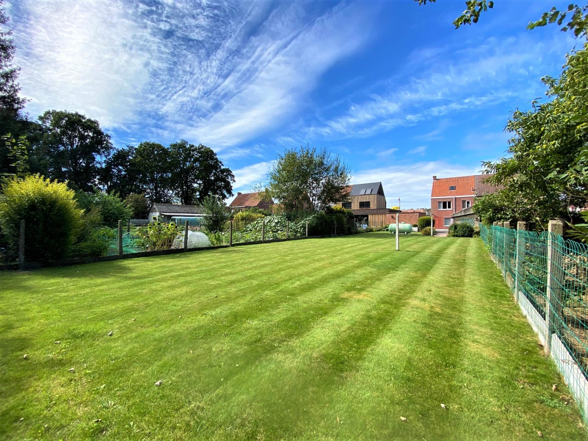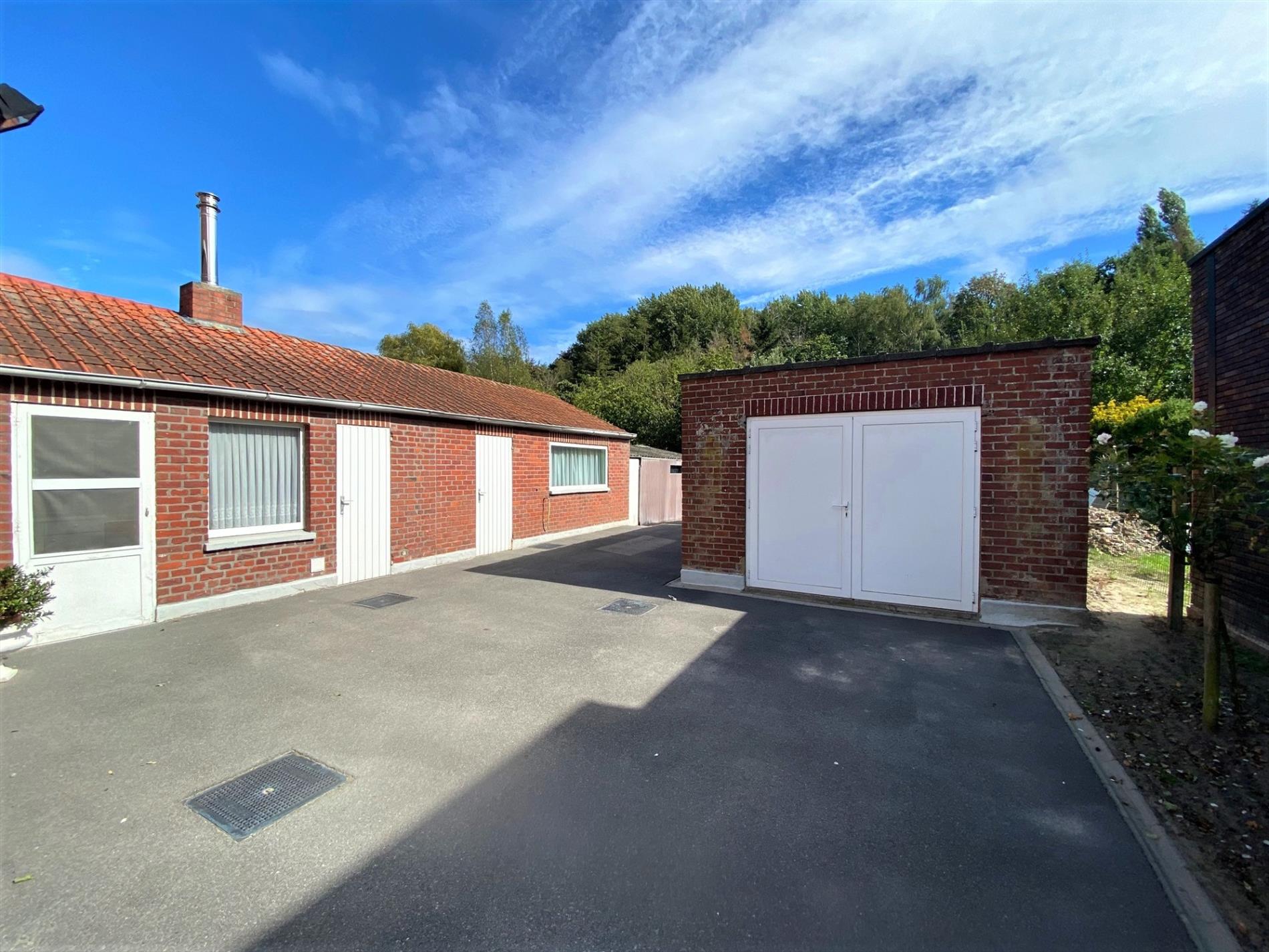 EXTERIEUR: De eigendom bevat aan de voorzijde een voortuin met haag, een oprit in asfalt, een berging, een garage (smalle doorgang - handmatige poort), een grasperk, een bloemenpark en een ruimte waar een moestuin mogelijk is.