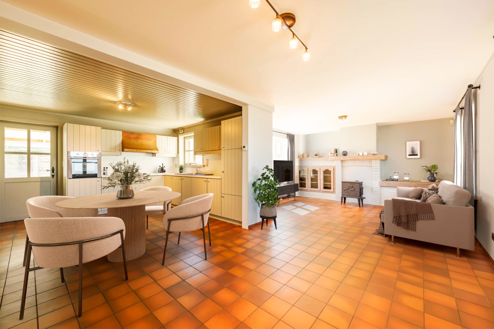 U komt binnen via de inkomhal met apart gastentoilet en vestiaire-ruimte. Verder is er toegang tot de lichtrijke leefruimte (31 m²) met aansluitend de open ingerichte keuken 14,50 m² (kookplaat | dampkap | spoelbak | frigo | oven) met vervolgens een veranda (18 m²). Praktisch is ook nog de wasplaats (8,50 m²).