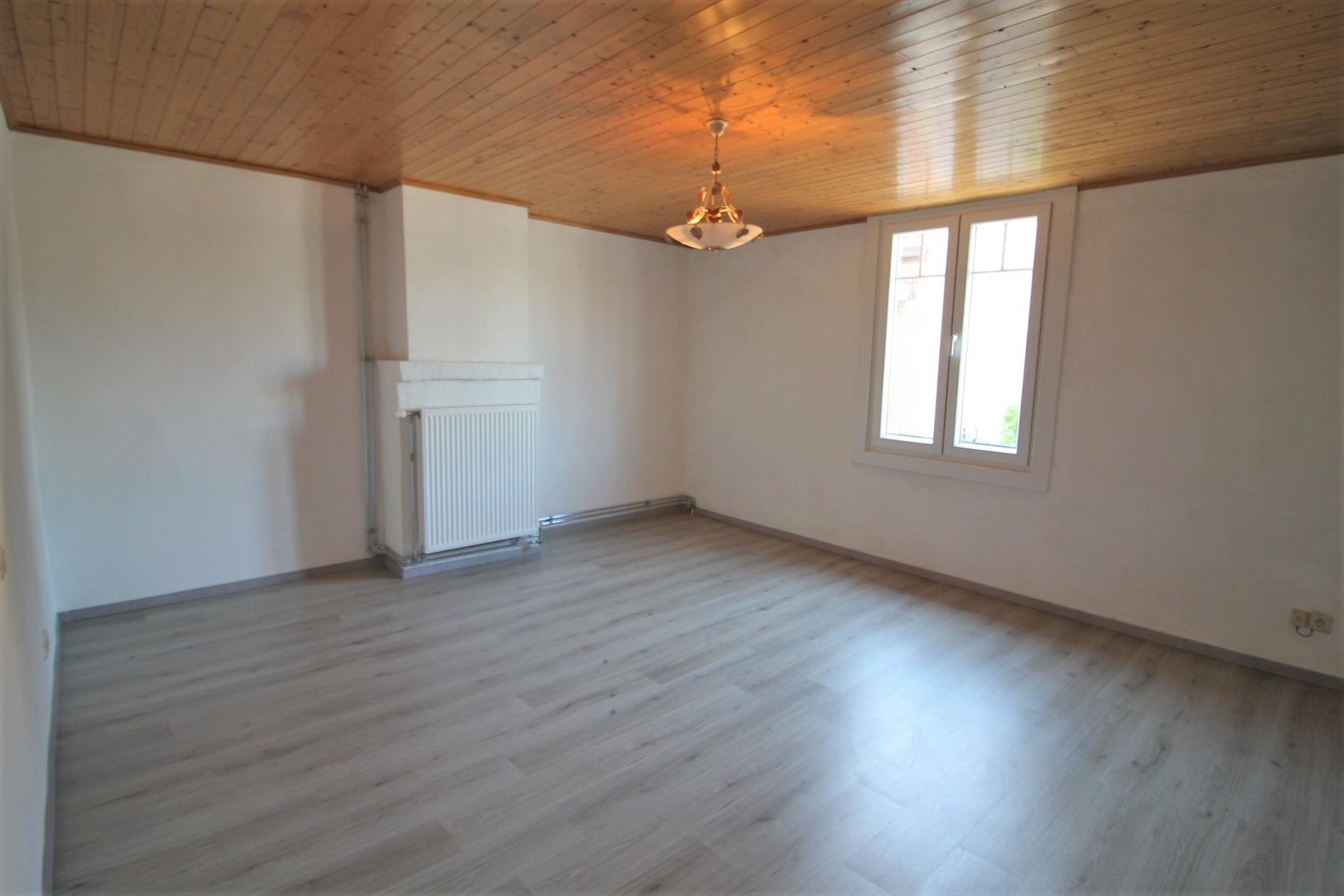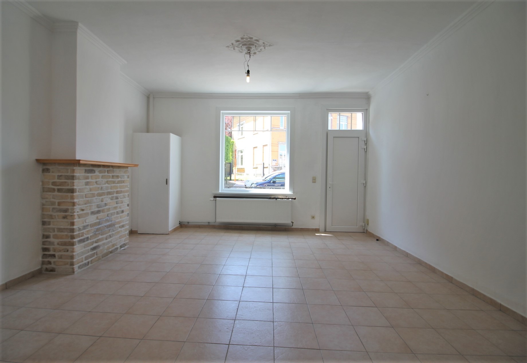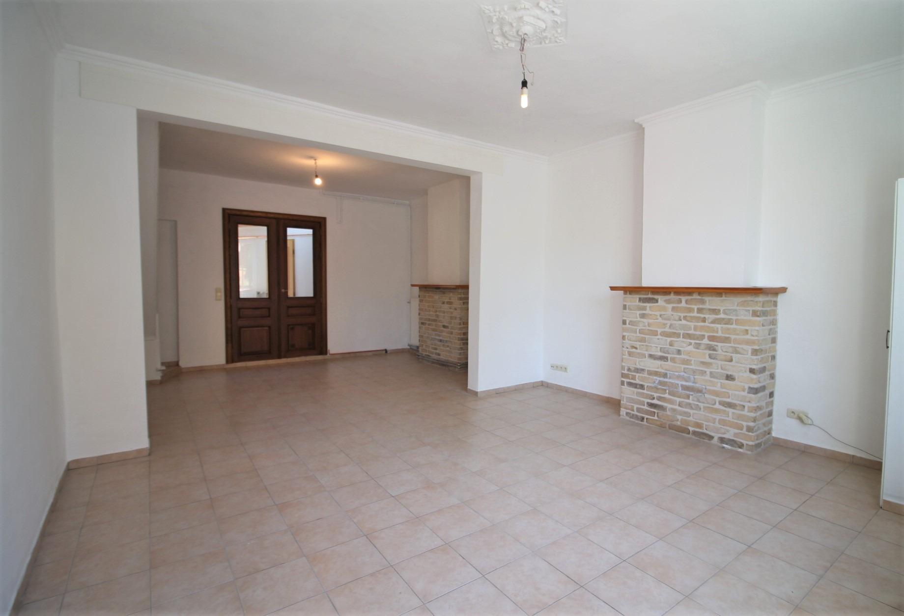 Ruime leefruimte met toegang via een authentieke dubbele deur naar de geïnstalleerde keuken.