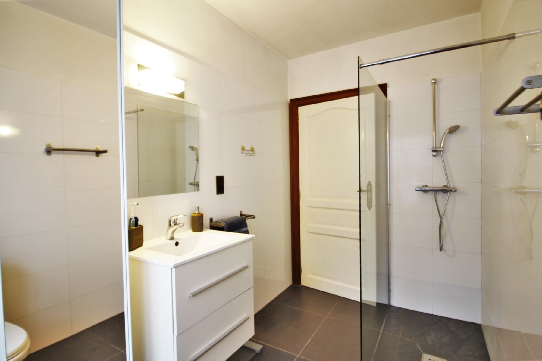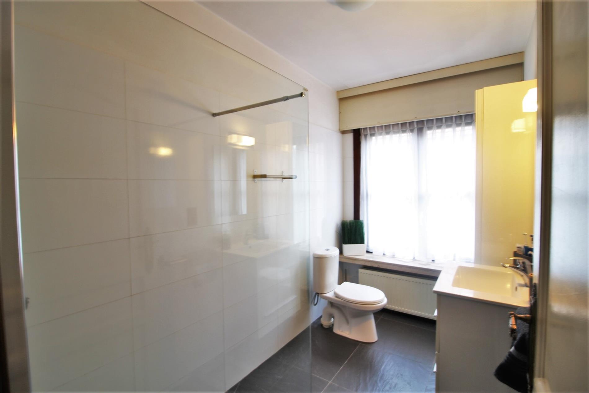 Op het gelijkvloers zijn ook twee slaapkamers en een badkamer aanwezig. De badkamer bestaat uit een inloopdouche, toilet en lavabo. Via de garage kan men terecht op de zolder.
