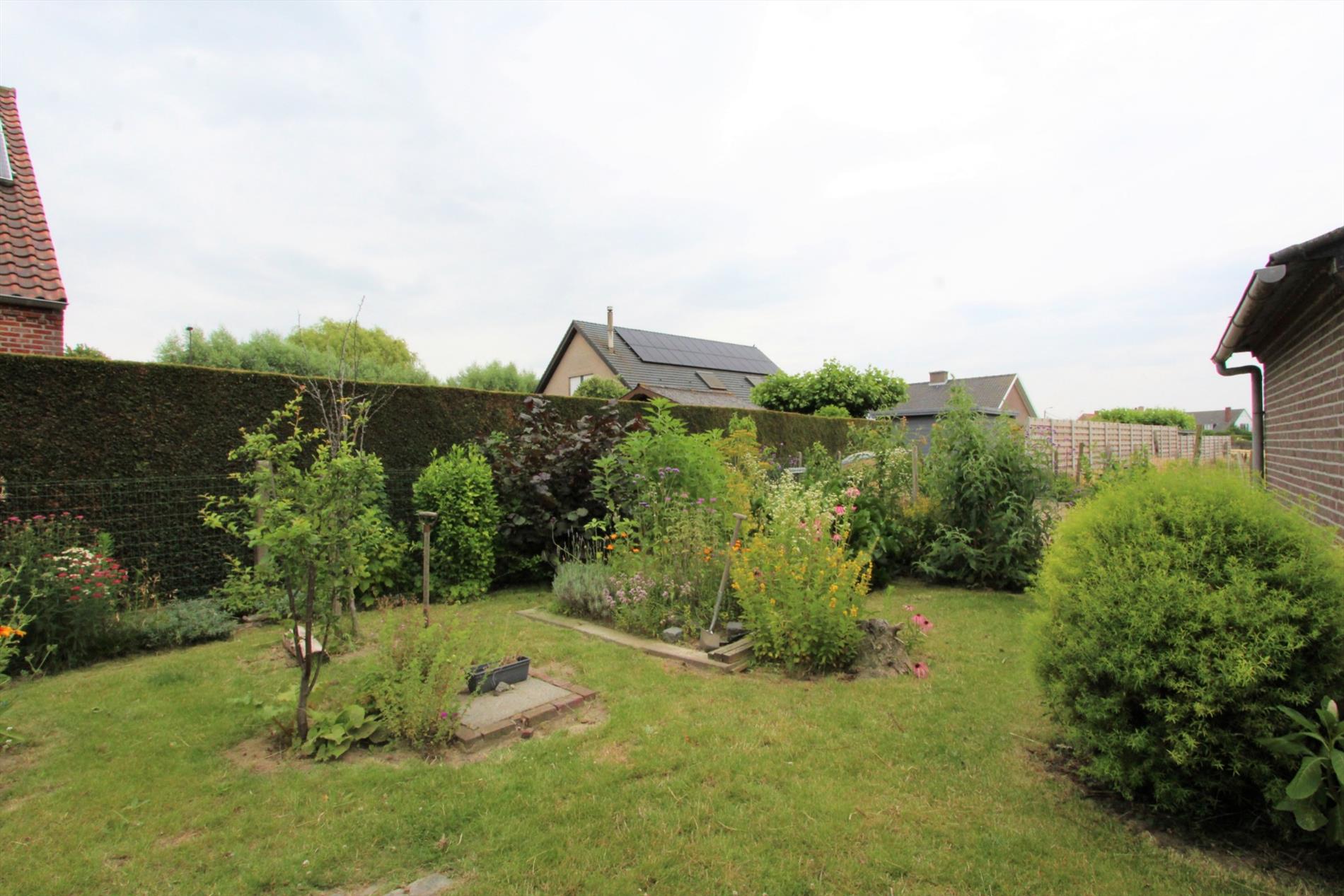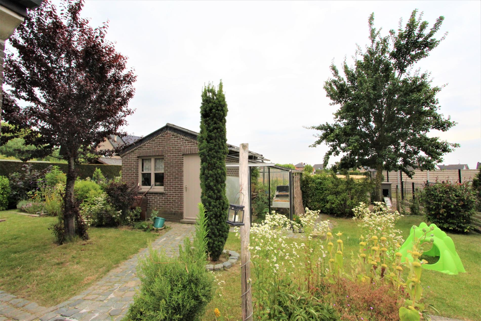 Vooraan de woning is er een grasperk met beplanting en achteraan de woning is er een knusse tuin met tuinhuis en serre.