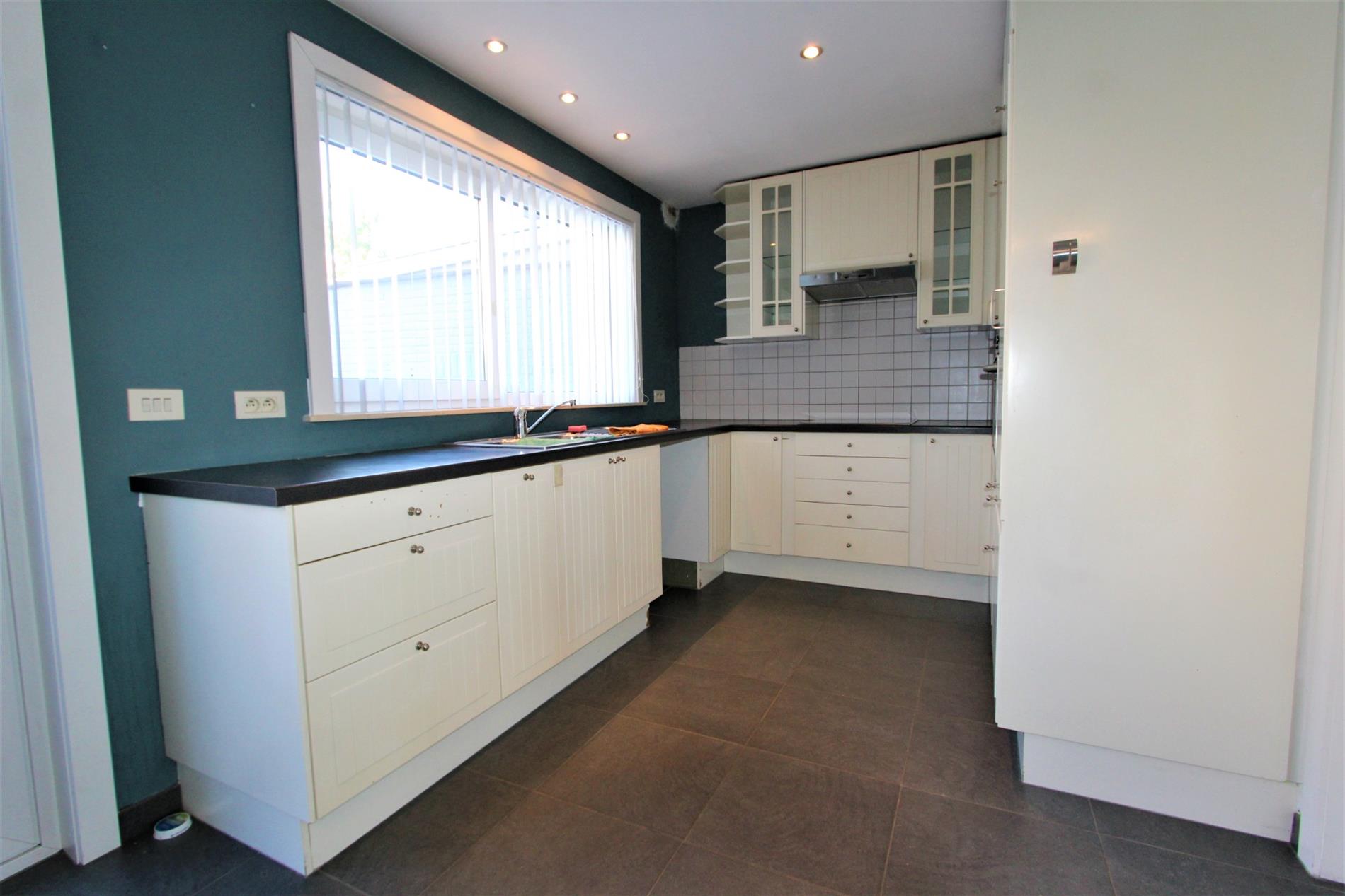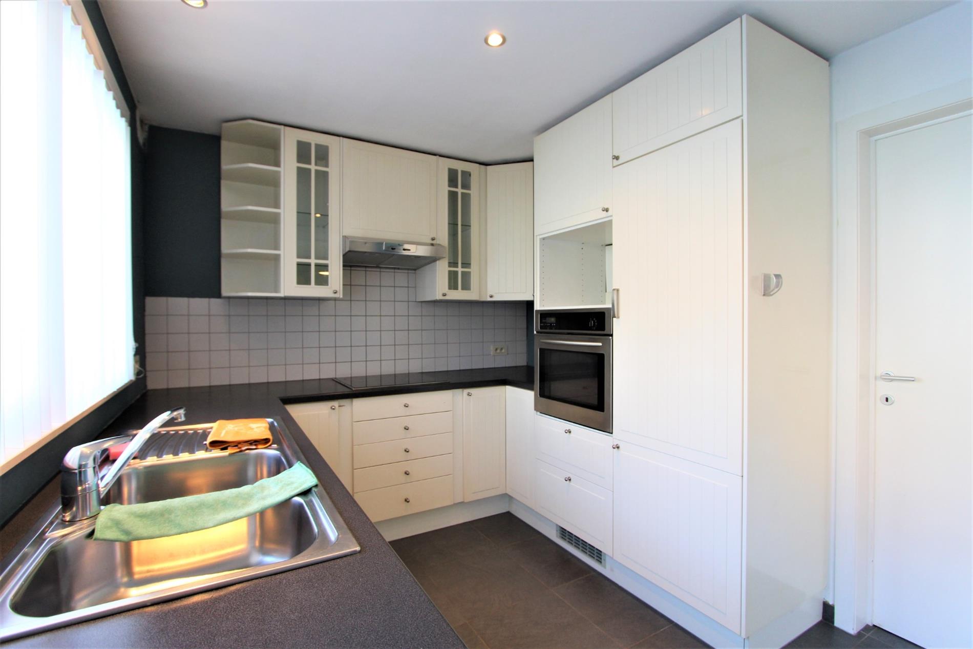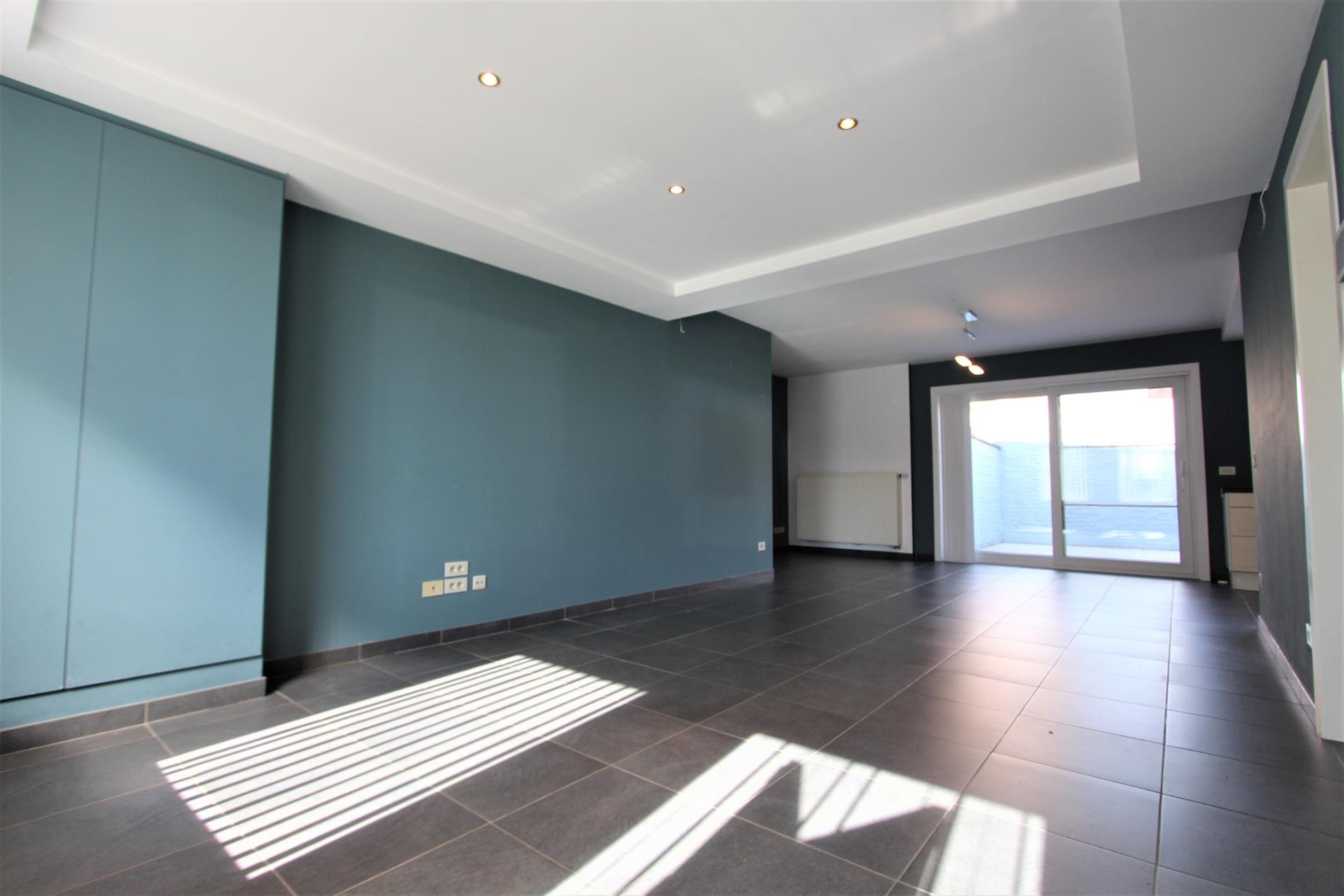 De woning omvat op het gelijkvloers een inkomhal met gastentoilet, ruime woonkamer (eetruimte en zitruimte) met aansluitend de open ingerichte keuken. De keuken omvat een spoelbak, vaatwas aansluiting, keramische kookplaat, dampkap, koelkast, oven en voorziening voor een microgolf. Via de keuken komt men terecht in de berging met wasmachine aansluiting of op het terras.