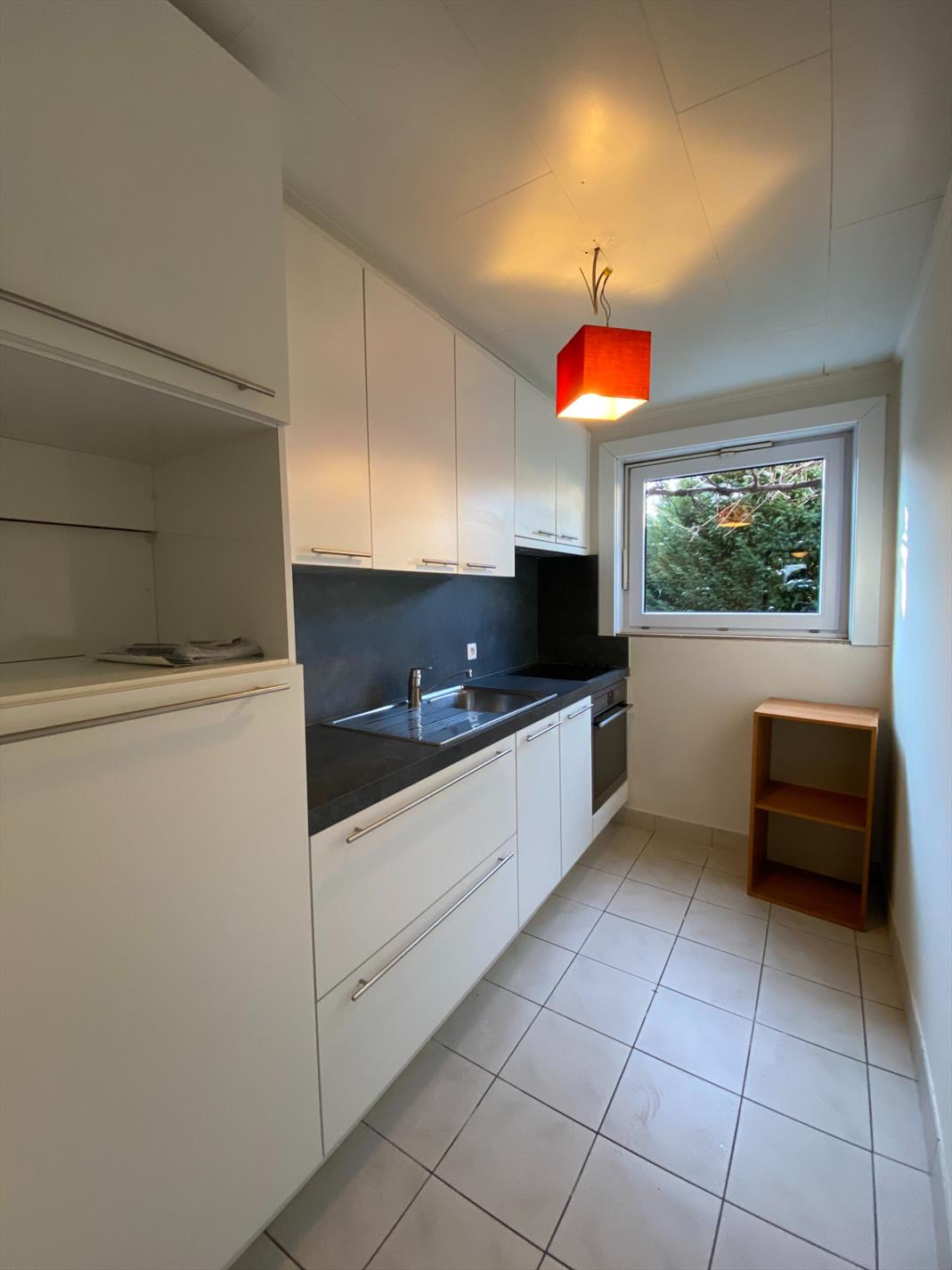 De keuken is voorzien van een dampkap, een kookplaat, een spoelbak, een oven en een koelkast.