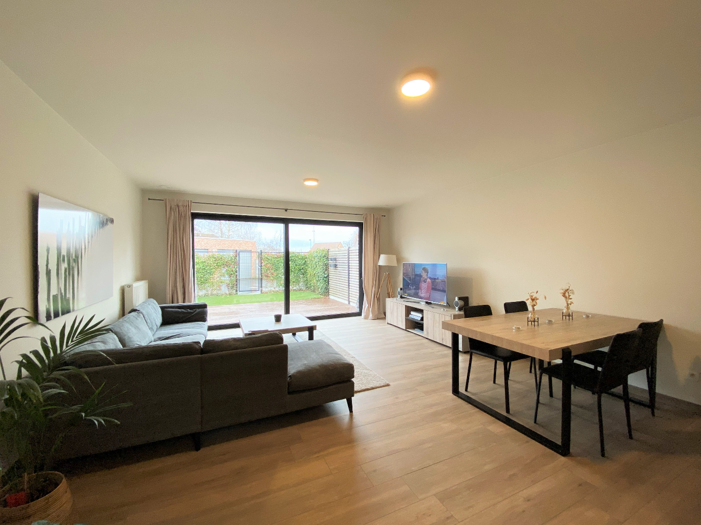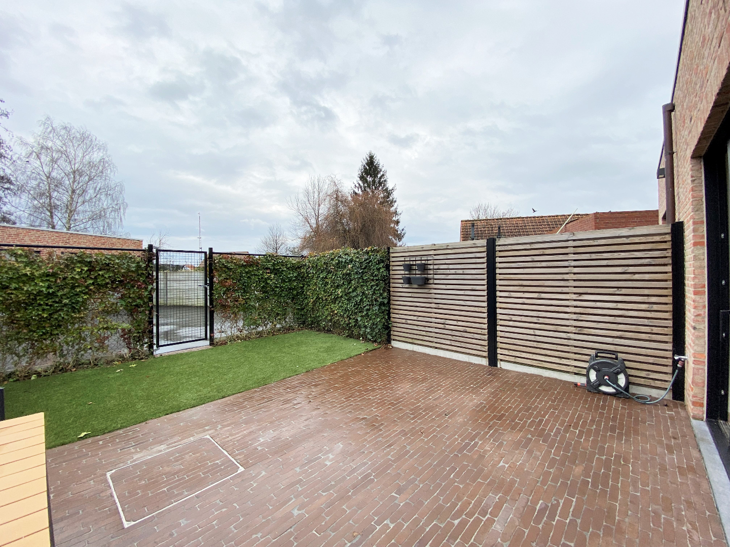Woning omvat een inkomhal met ingemaakte kasten (deels in gebruik voor meters van de nutsvoorzieningen), een gastentoilet, leefruimte met directe toegang tot het terras en de volledig ingerichte keuken met koele berging.