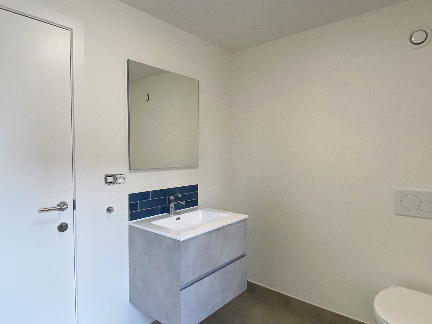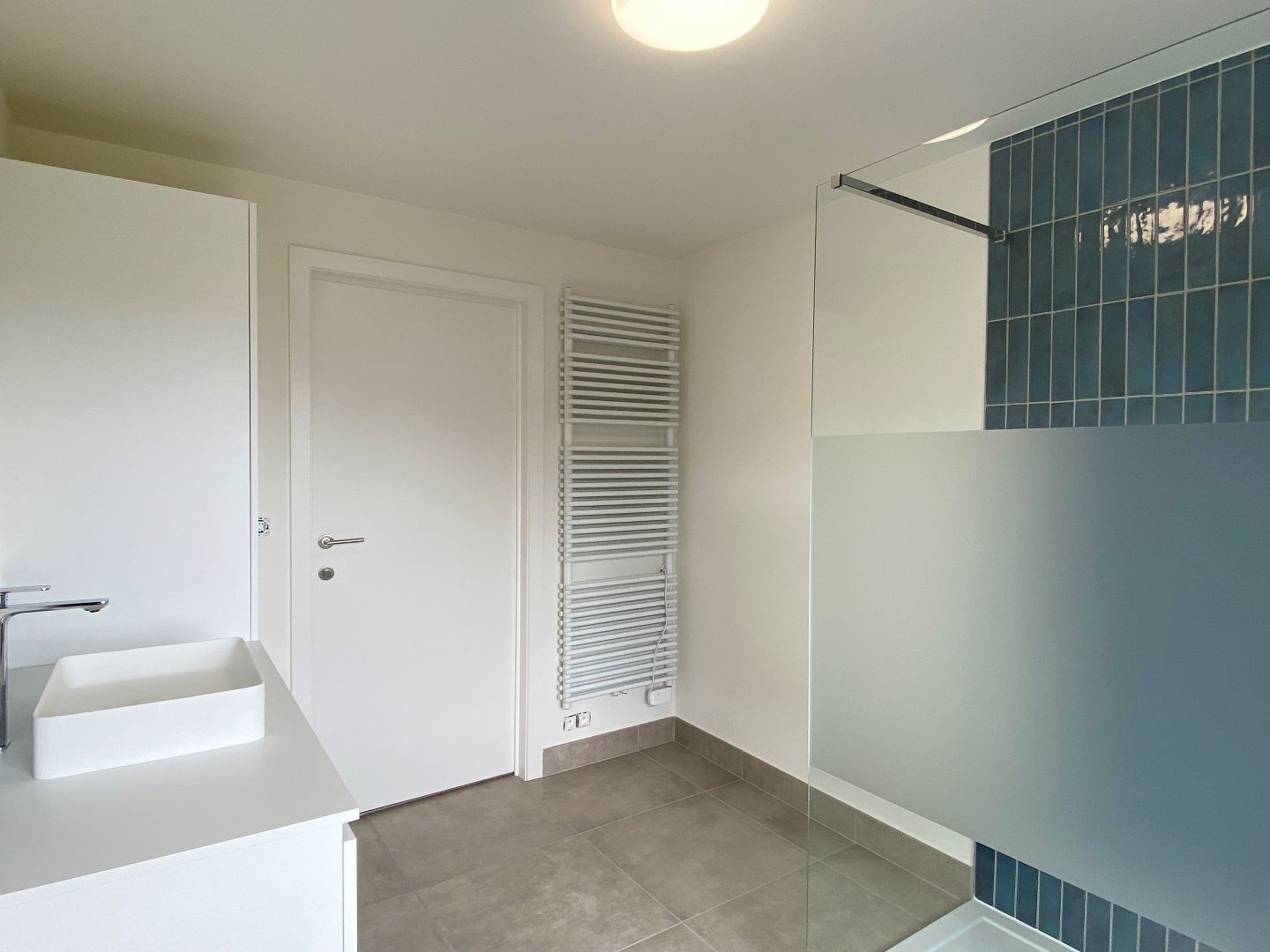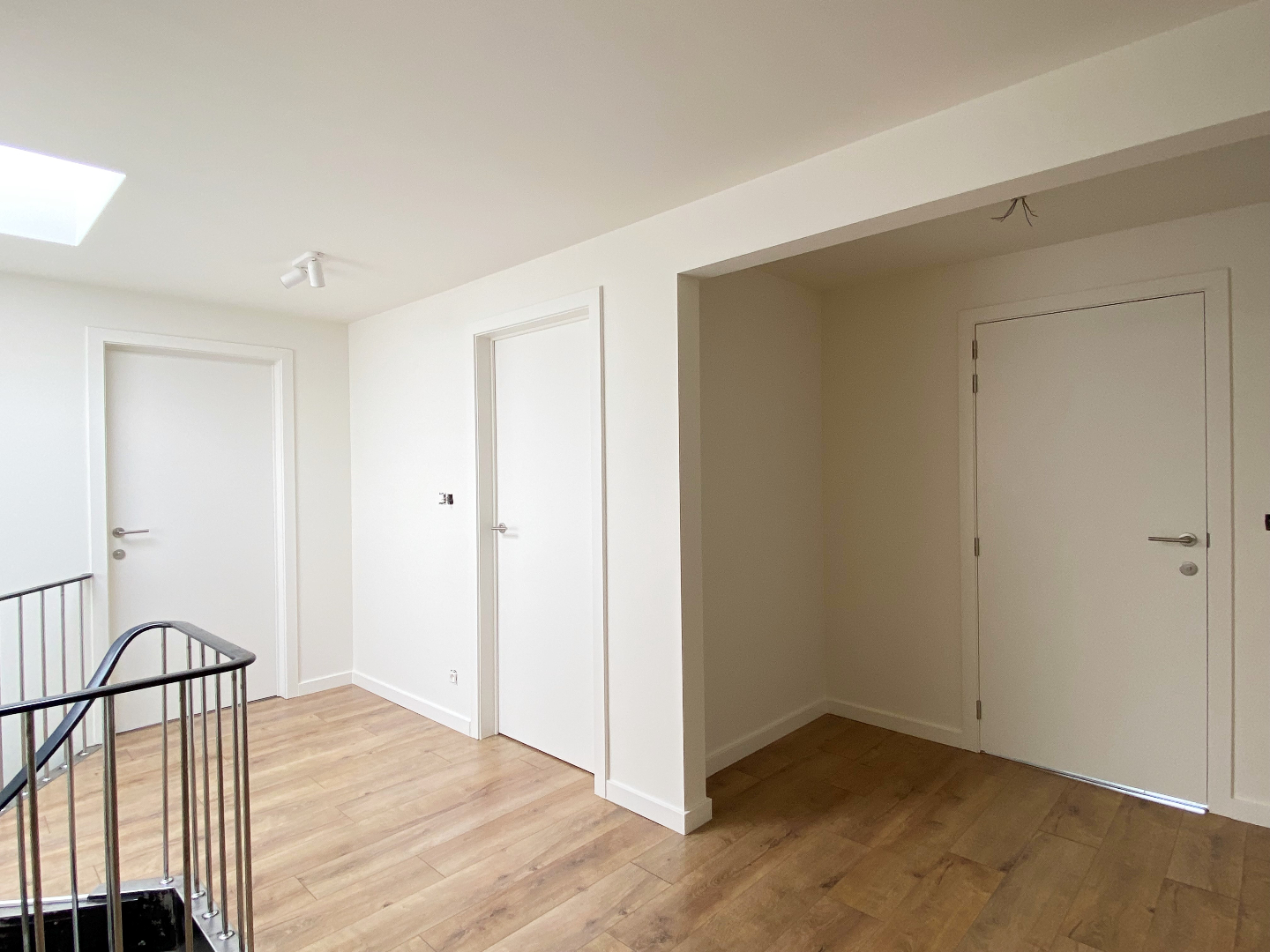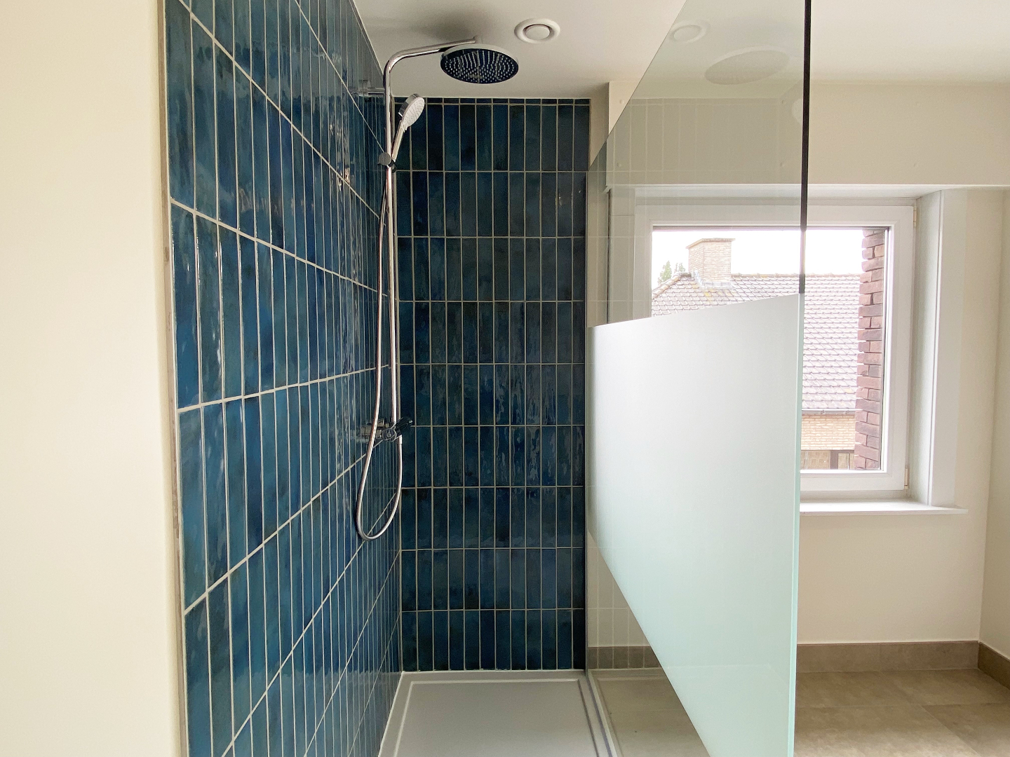 Via een vaste trap komt U terecht op het verdiep. Het verdiep omvat een nachthal, 3 volwaardige slaapkamers telkens voorzien van verlichting en rolluiken. Vervolgens is er ook de moderne badkamer met inloopdouche, lavabomeubel en vastgemaakte kasten. Op het verdiep is ook een apart toilet met wastafel.