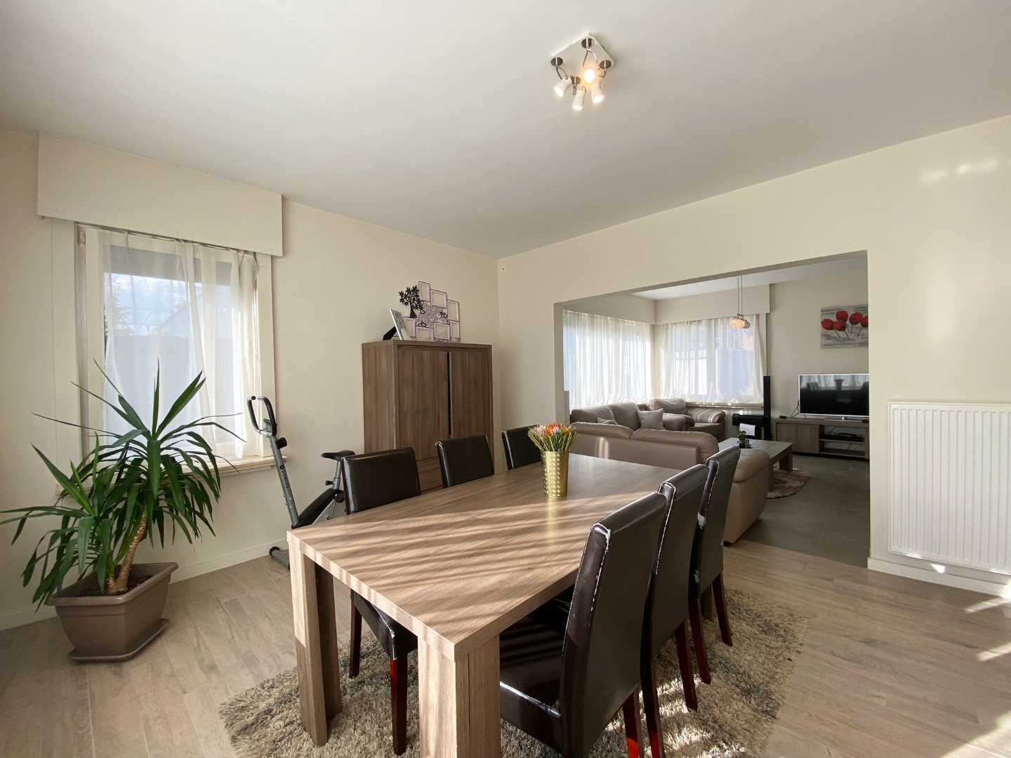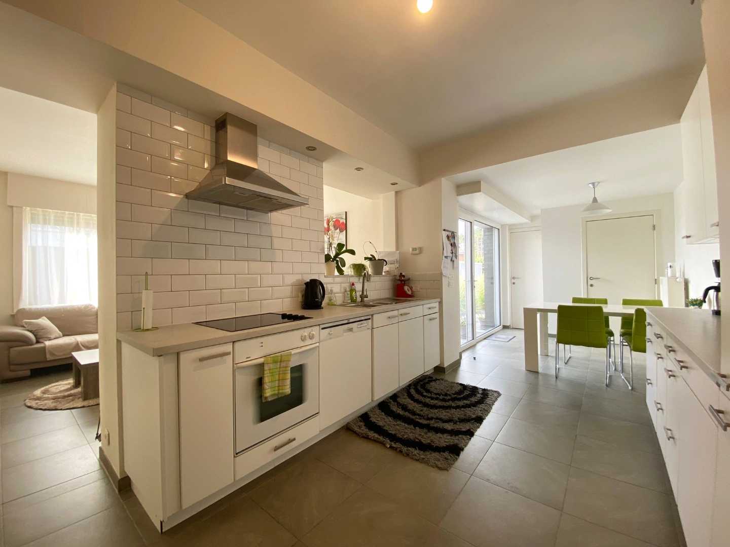 U komt binnen via de inkomhal die meteen toegang biedt tot de lichtrijke eetkamer met zithoek en de keuken. De keuken is volledig vernieuwd en ingericht (vitrokeramische kookplaat - oven - microgolf - frigo - diepvries - vaatwas - dubbele spoelbak).