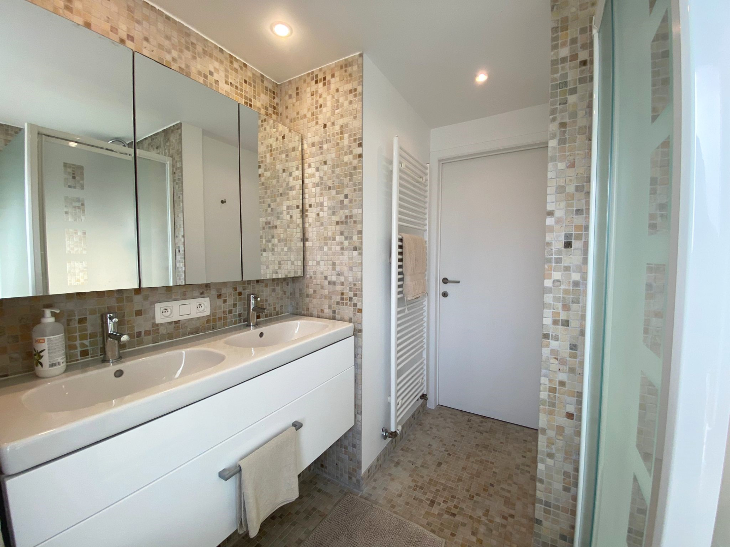 Op de 1ste verdieping zijn er 3 ruime slaapkamers ( 18 m², 17 m² en 9,30 m²) en een moderne ingerichte badkamer met douche, dubbele lavabo met extra kastruimte en toilet.