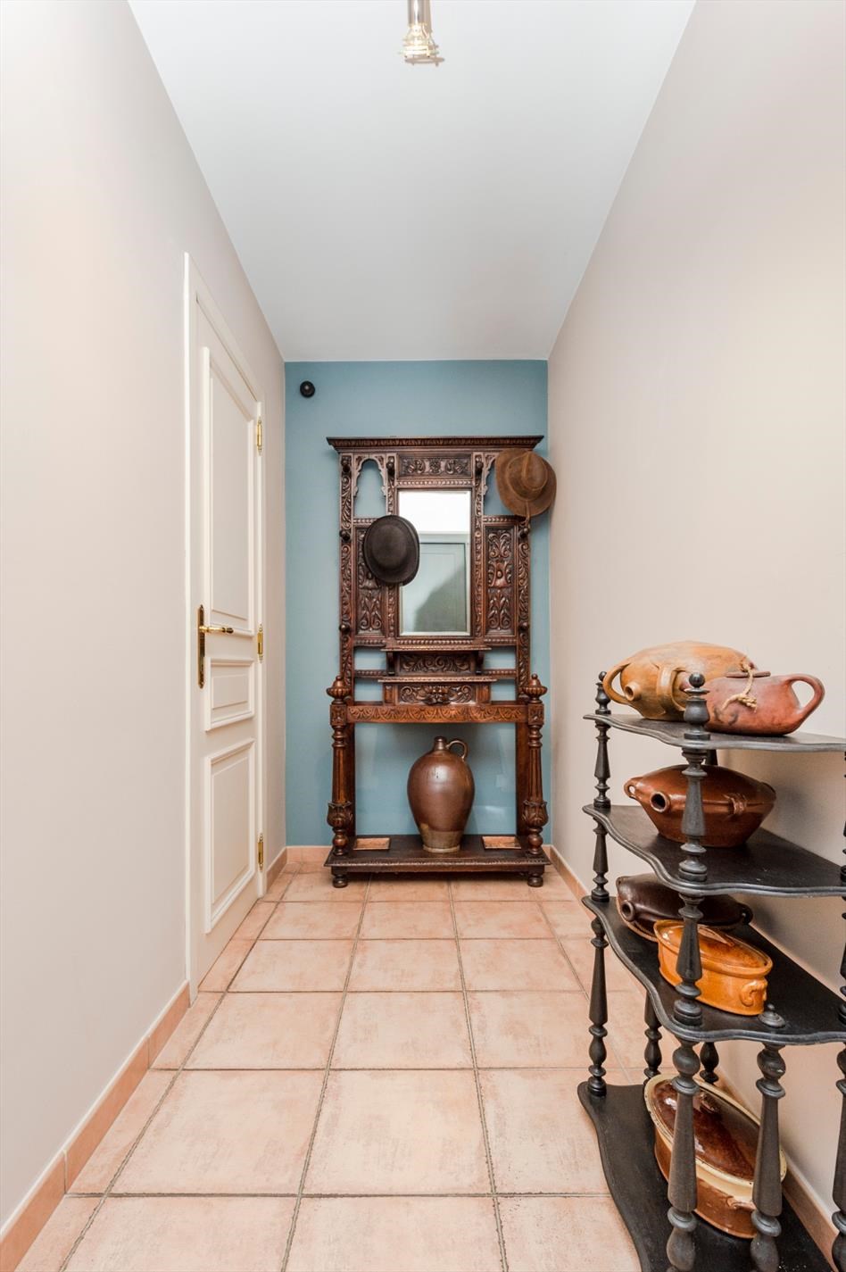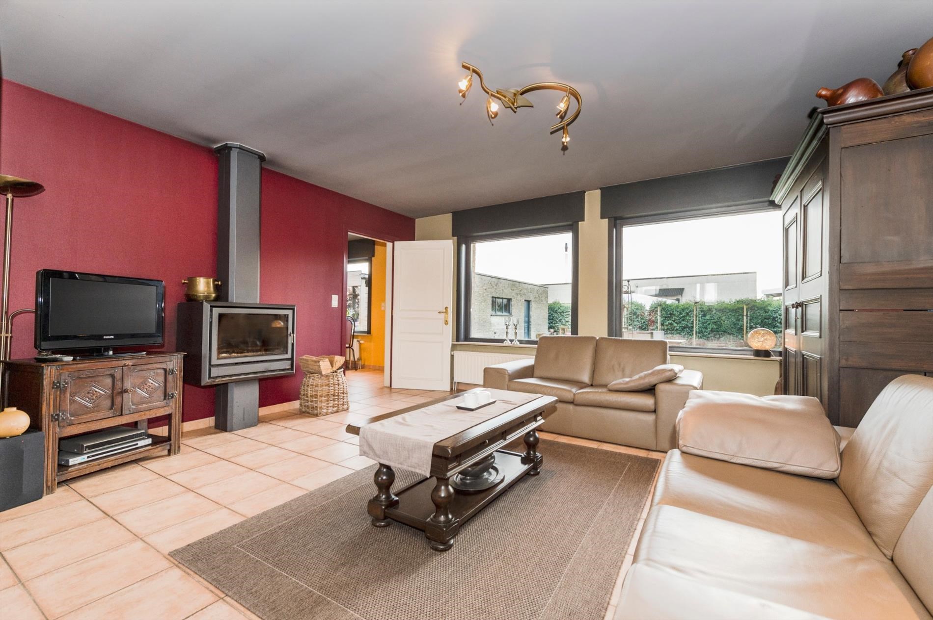 We komen binnen in een ruime inkomhal met gastentoilet. Via de inkomhal komt U in de leefruimte, deze meet 35 m² en is voorzien van grote raampartijen en een mooie recente open haard.