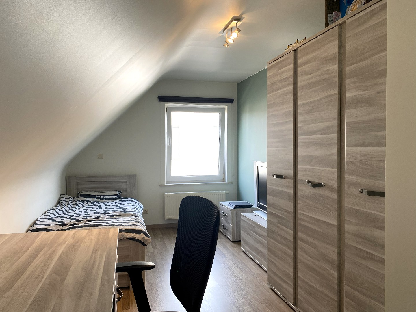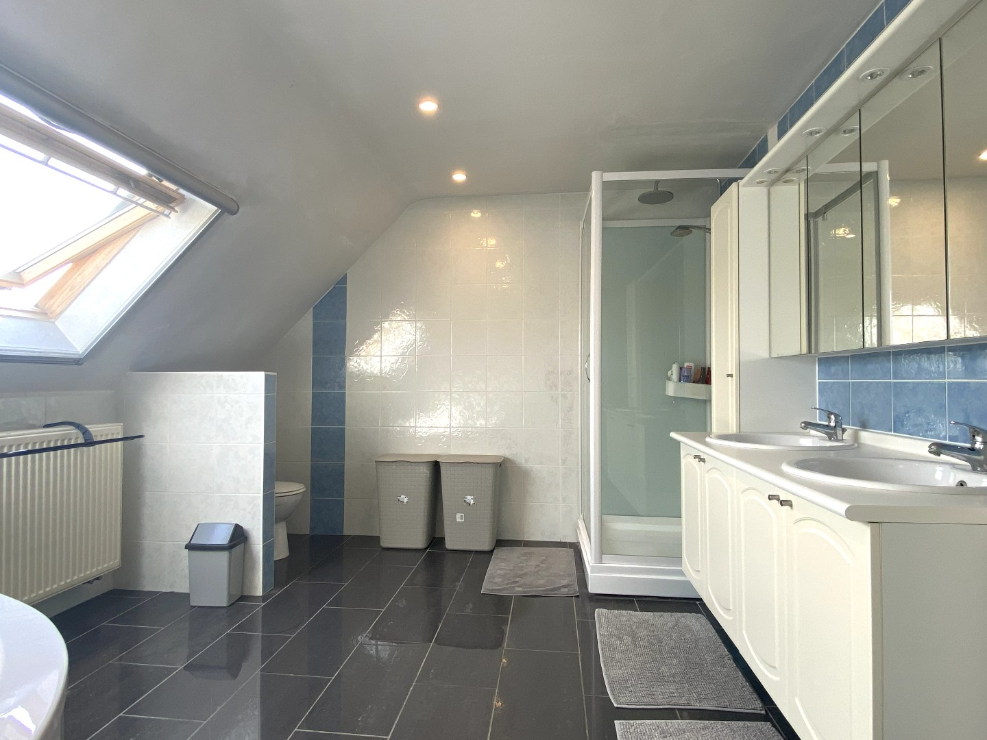 Het verdiep omvat de nachthal met toegang tot de 3 slaapkamers en de ingerichte badkamer (lavabo, toilet, hoekbad en douche). De geïsoleerde zolder is te betreden via een uitklapbare trap.