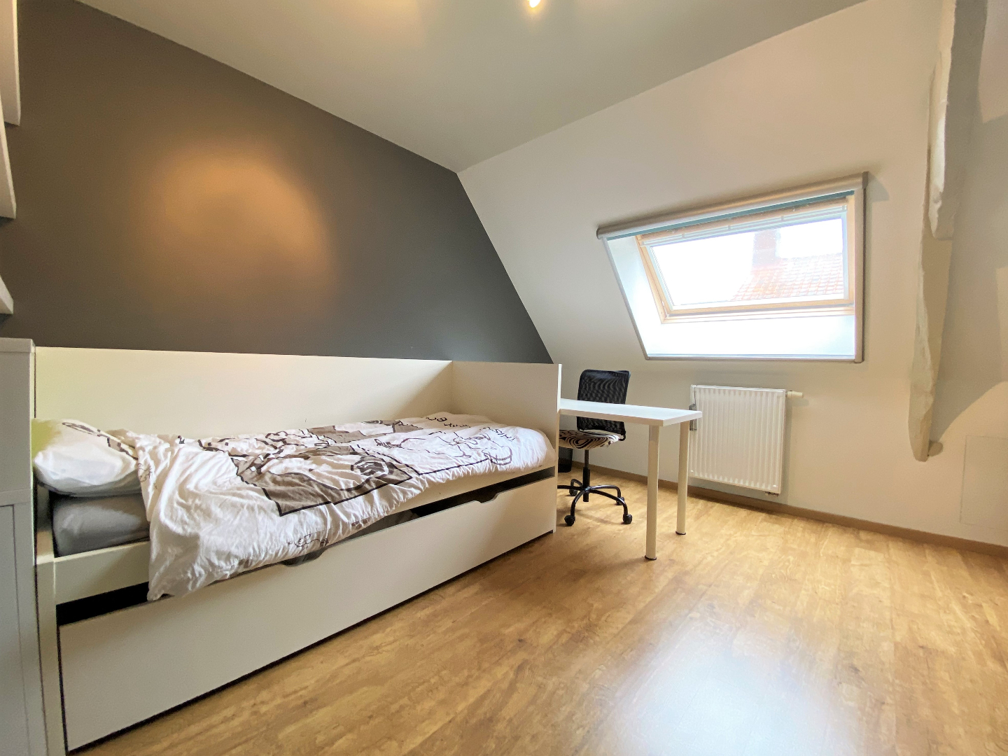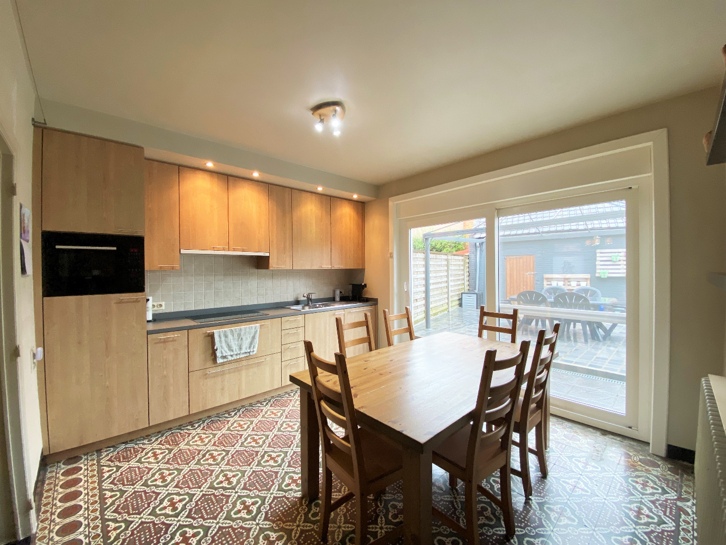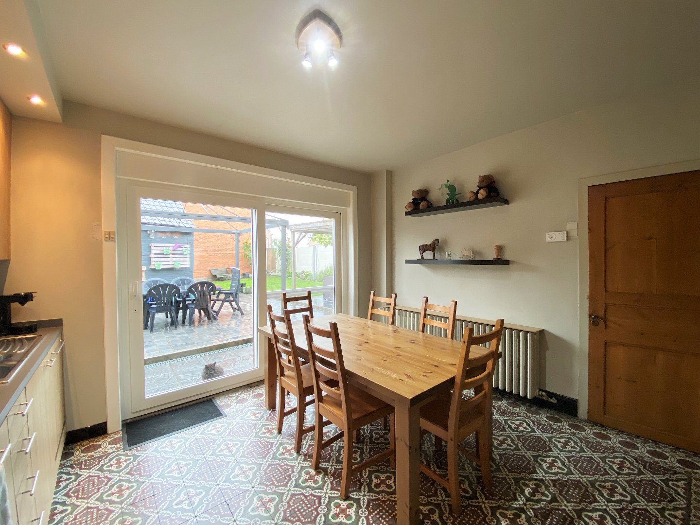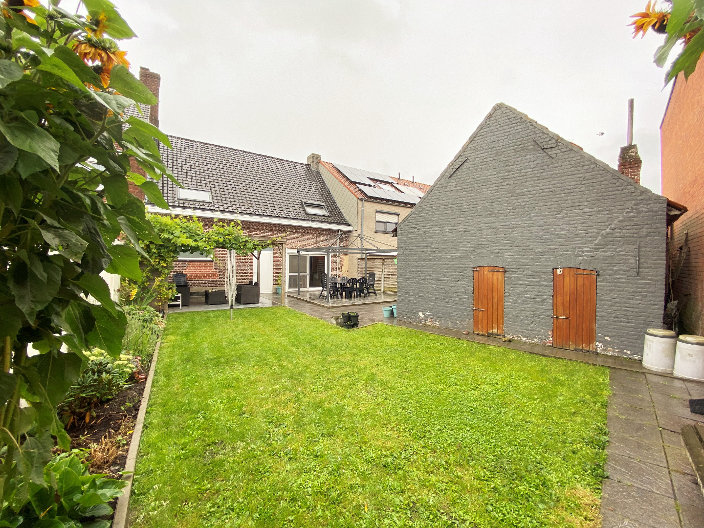 Het exterieur van deze woning werd voorzien van een zongerichte tuin met terras - een overdekt terras en een stockageruimte. Via het achterpoortje kan u de woning verlaten.