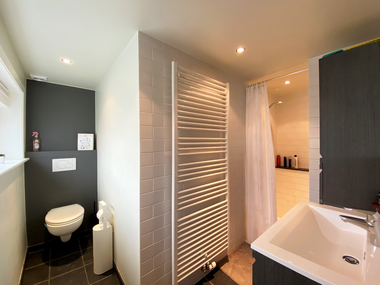 Via een vaste trap komt u op de voute terecht. Hier is een eerste badkamer met douche, toilet en lavabo met meubel.