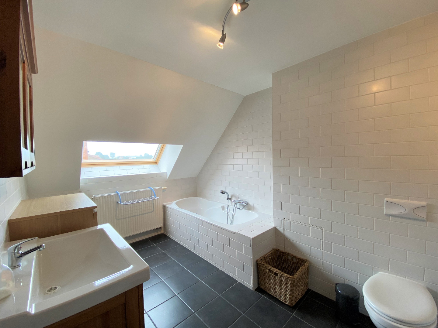 Op het verdiep zijn er 3 slaapkamers en een 2de badkamer met ligbad, toilet en lavabo met meubel.