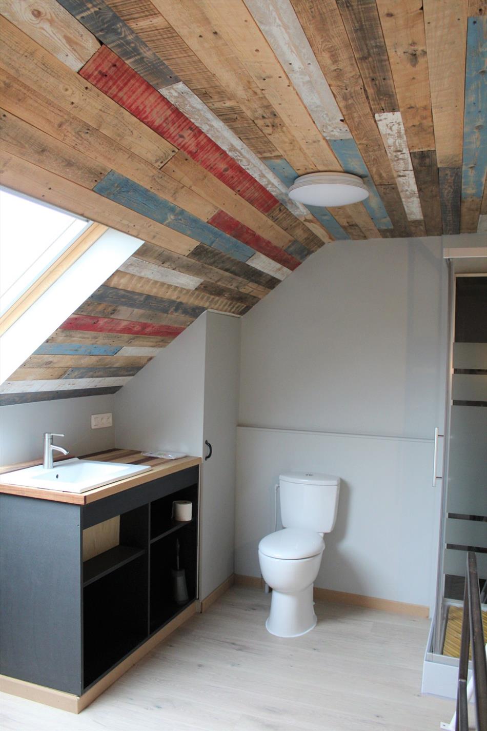 Het verdiep telt één slaapkamer met ingemaakte kasten en een ingerichte badkamer (lavabo/douche en toilet).